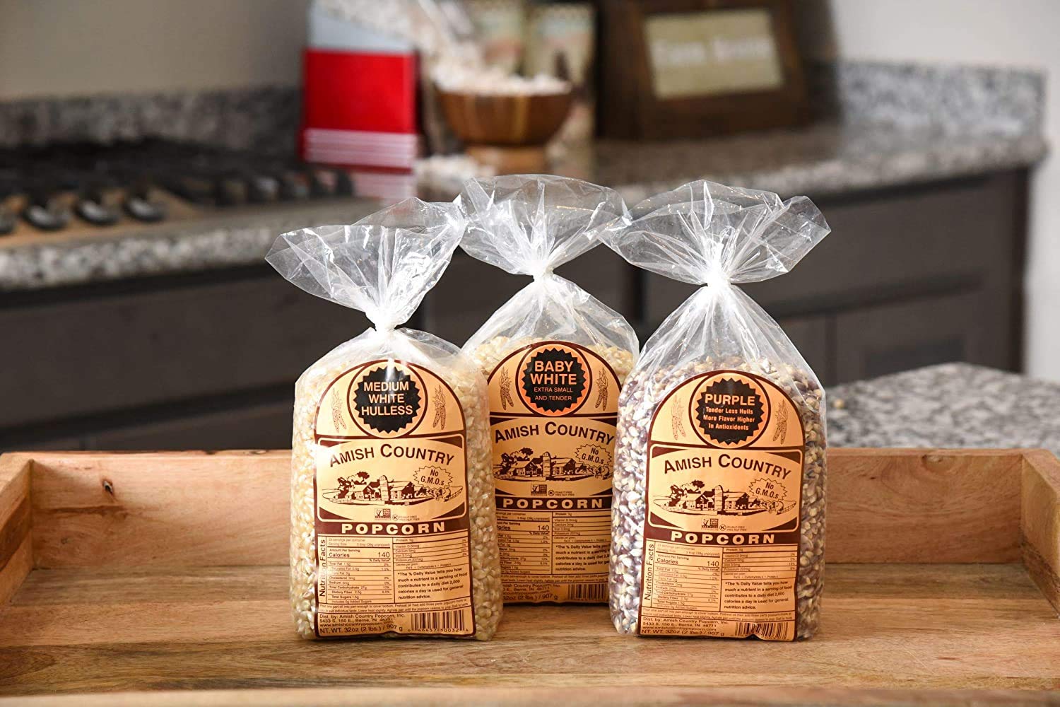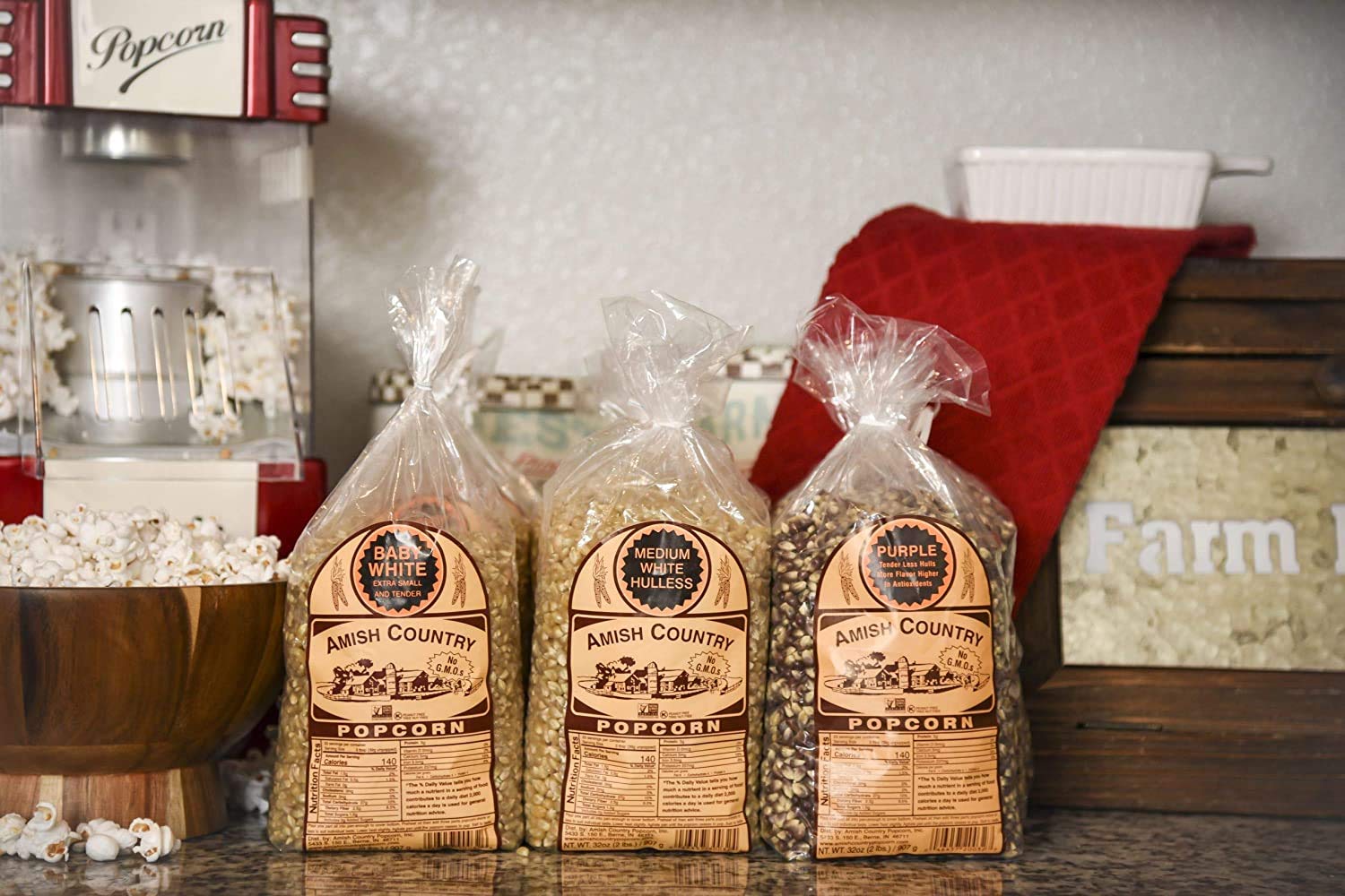Q: What types of popcorn are included in the Amish Country Popcorn variety bundle?A: The Amish Country Popcorn variety bundle includes three 2-pound bags of popcorn: Medium White, Baby White, and Purple popcorn kernels.