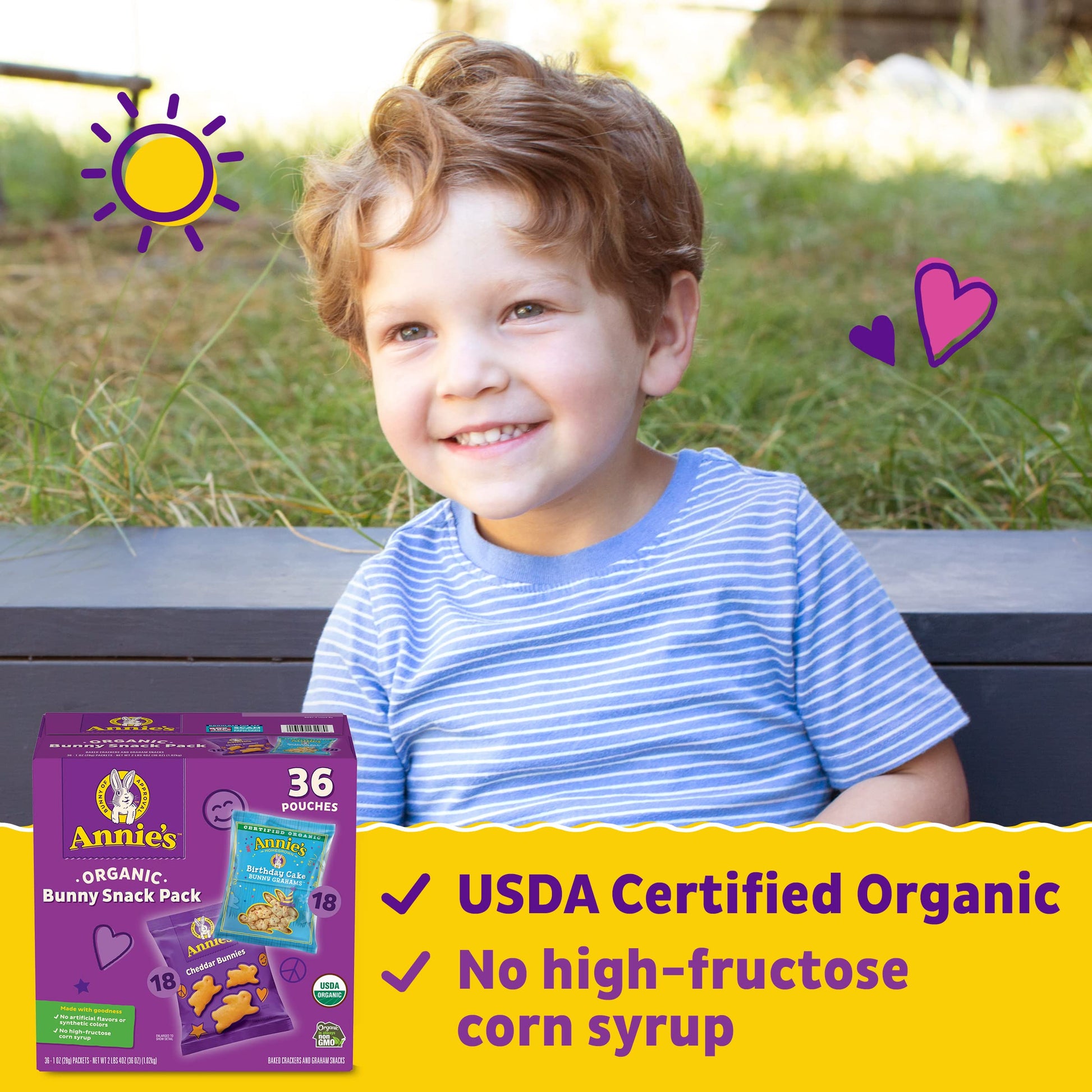 Q: How many snacks are included in the Annie's Organic Bunny Snack Pack?A: The Annie's Organic Bunny Snack Pack includes a total of 36 pouches, featuring both Original Cheddar Bunnies and Birthday Cake Bunny Grahams.