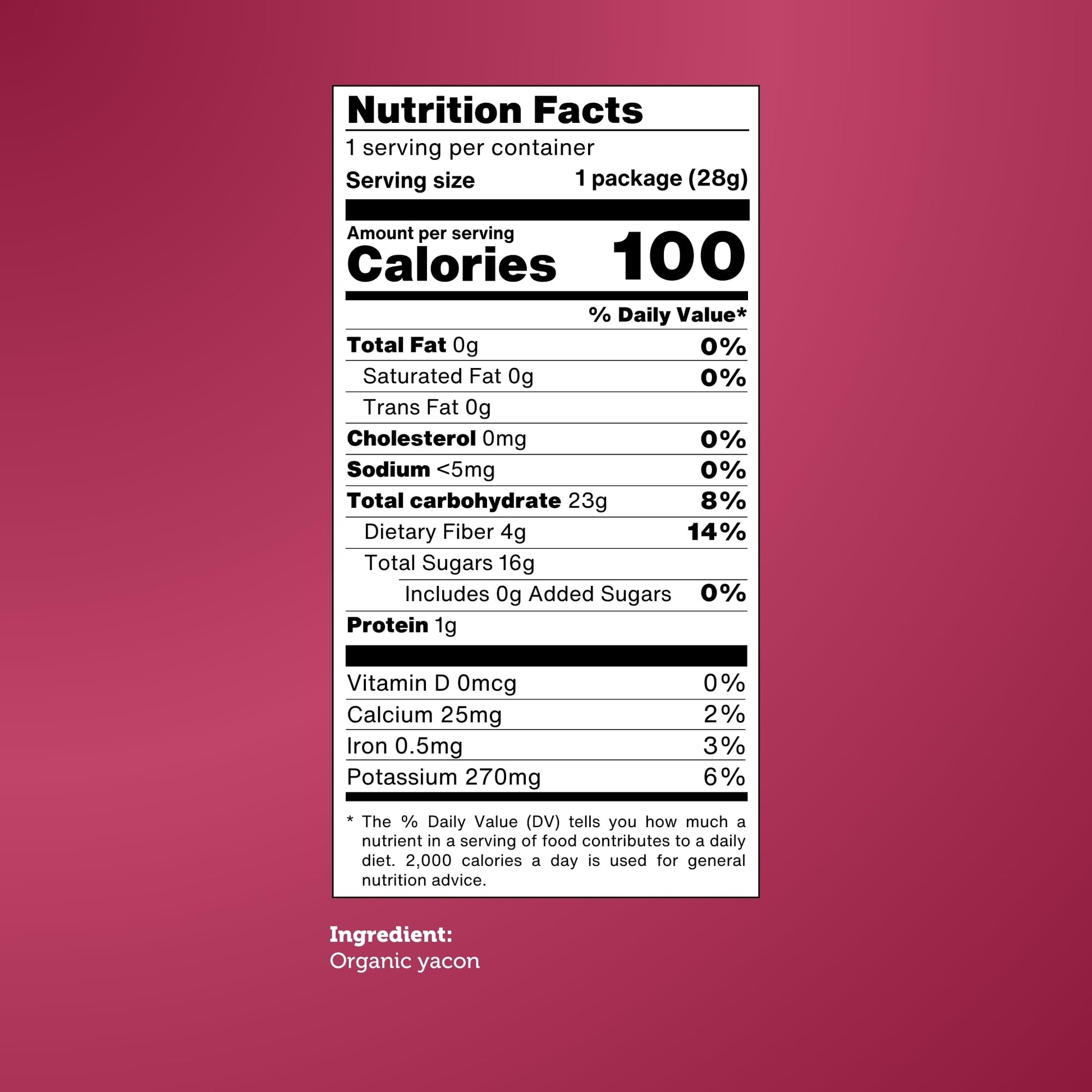 Q: What is the serving size and packaging of the Yacon Chips?A: The Baked Organic Yacon Chips come in a pack of 8 single-serve bags, with each bag containing 1 ounce of chips, making them convenient for on-the-go snacking.
