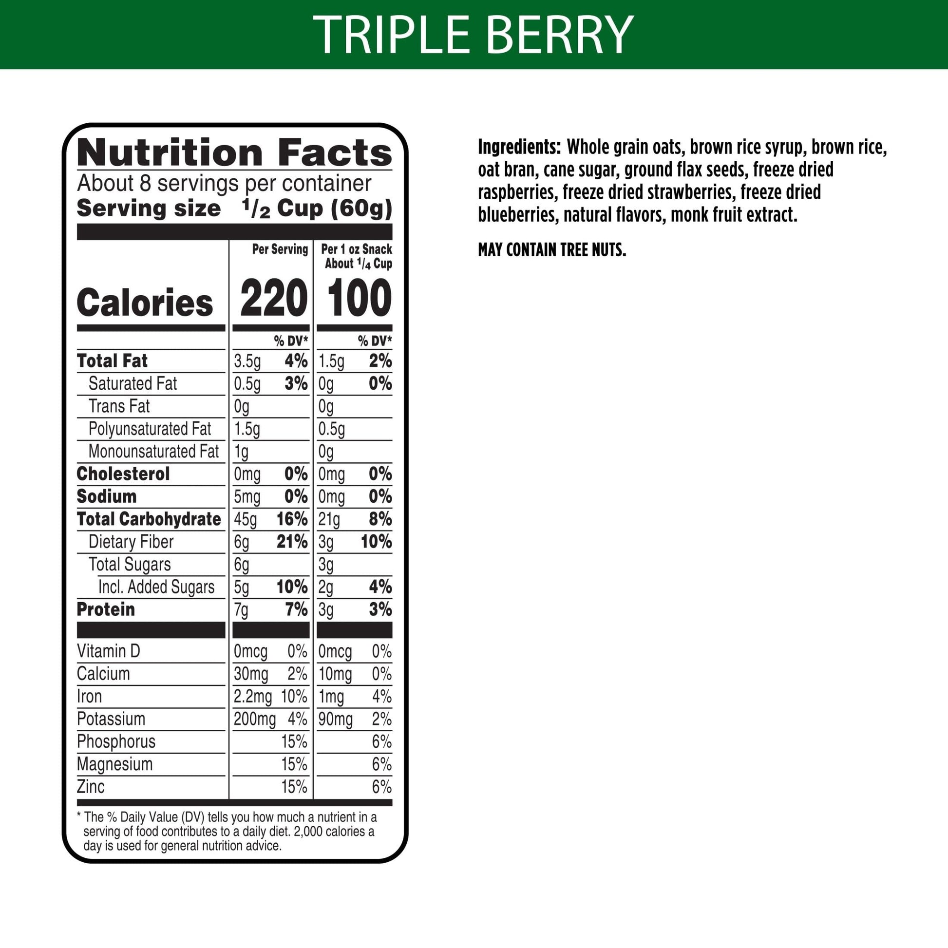 Q: Is Bear Naked Triple Berry Crunch granola a healthy snack?A: Yes, this granola is a good source of fiber and contains 29g of whole grain per serving. It is also Non-GMO Project Verified and USDA Whole Grain-Rich, making it a nutritious choice for a breakfast or snack.