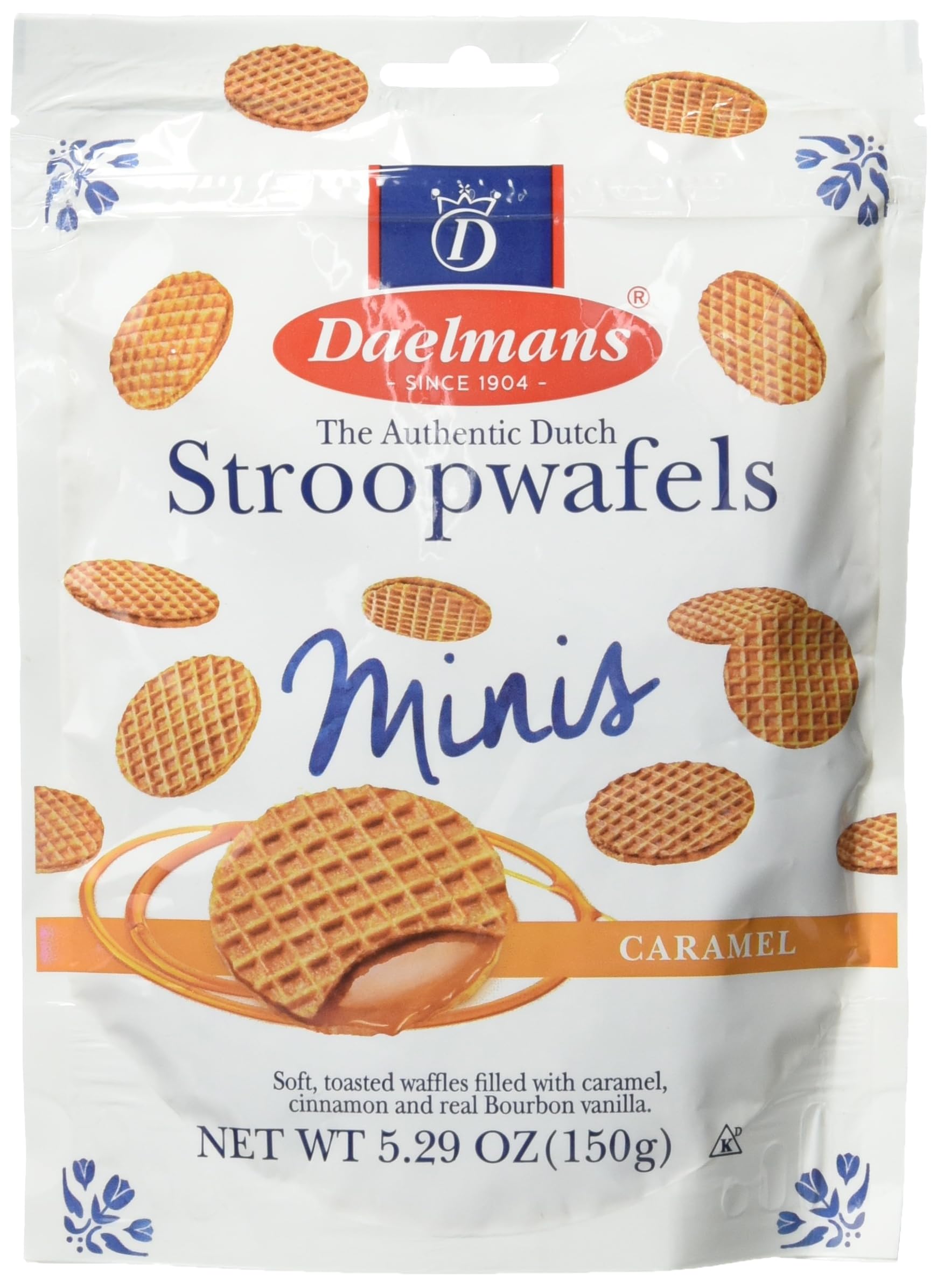 Q: What is the size of each Daelmans Stroopwafel?A: Each pouch contains mini size Stroopwafels, making them perfect for snacking on the go. The total weight of the pouch is 5.29 ounces.