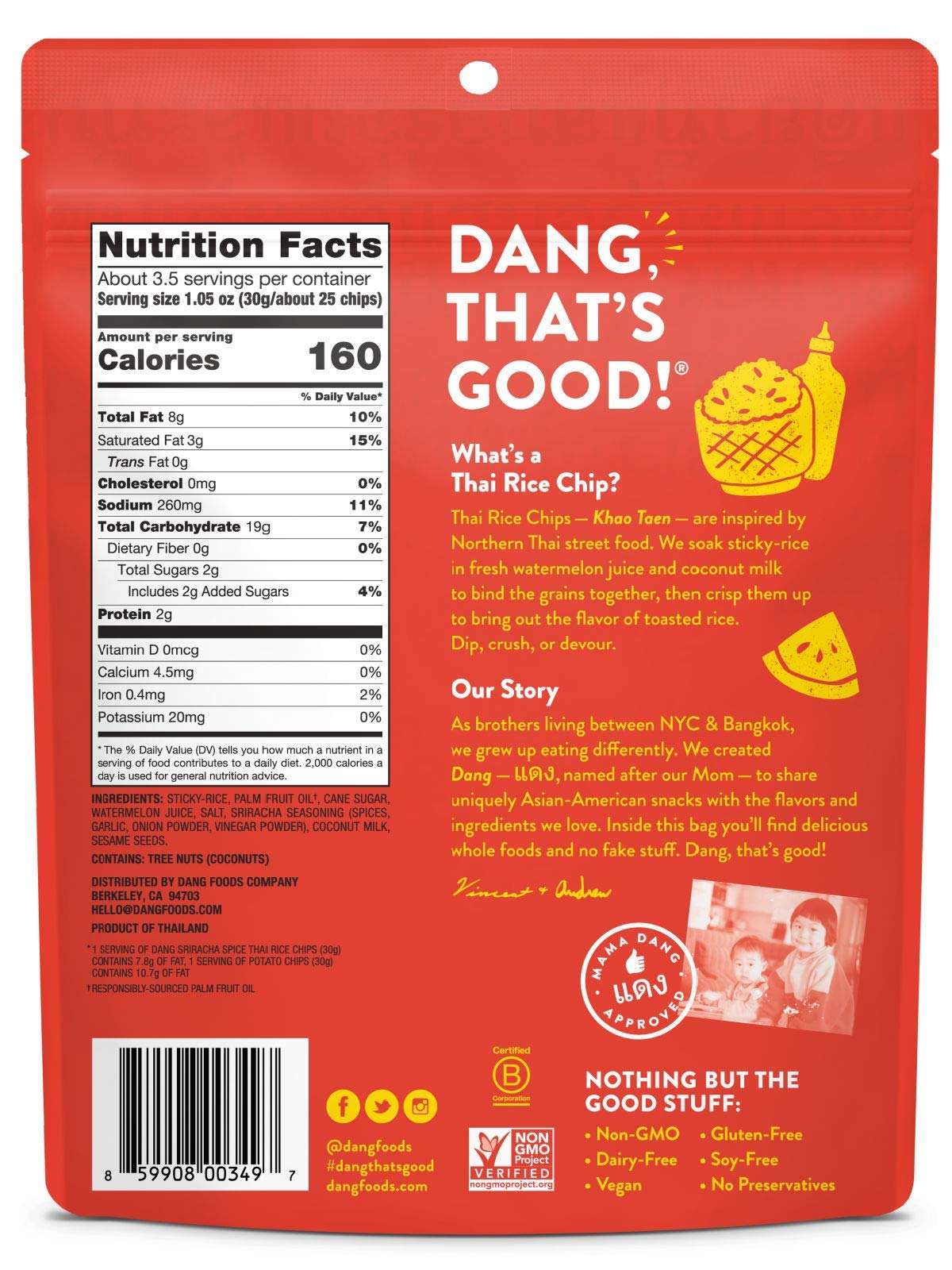 Q: What are Dang Sticky Rice Chips made from?A: Dang Sticky Rice Chips are made from simple, healthy ingredients including sticky rice soaked in fresh watermelon juice and coconut milk. They are gluten-free, non-GMO, dairy-free, and soy-free, making them a great snack choice for health-conscious individuals.