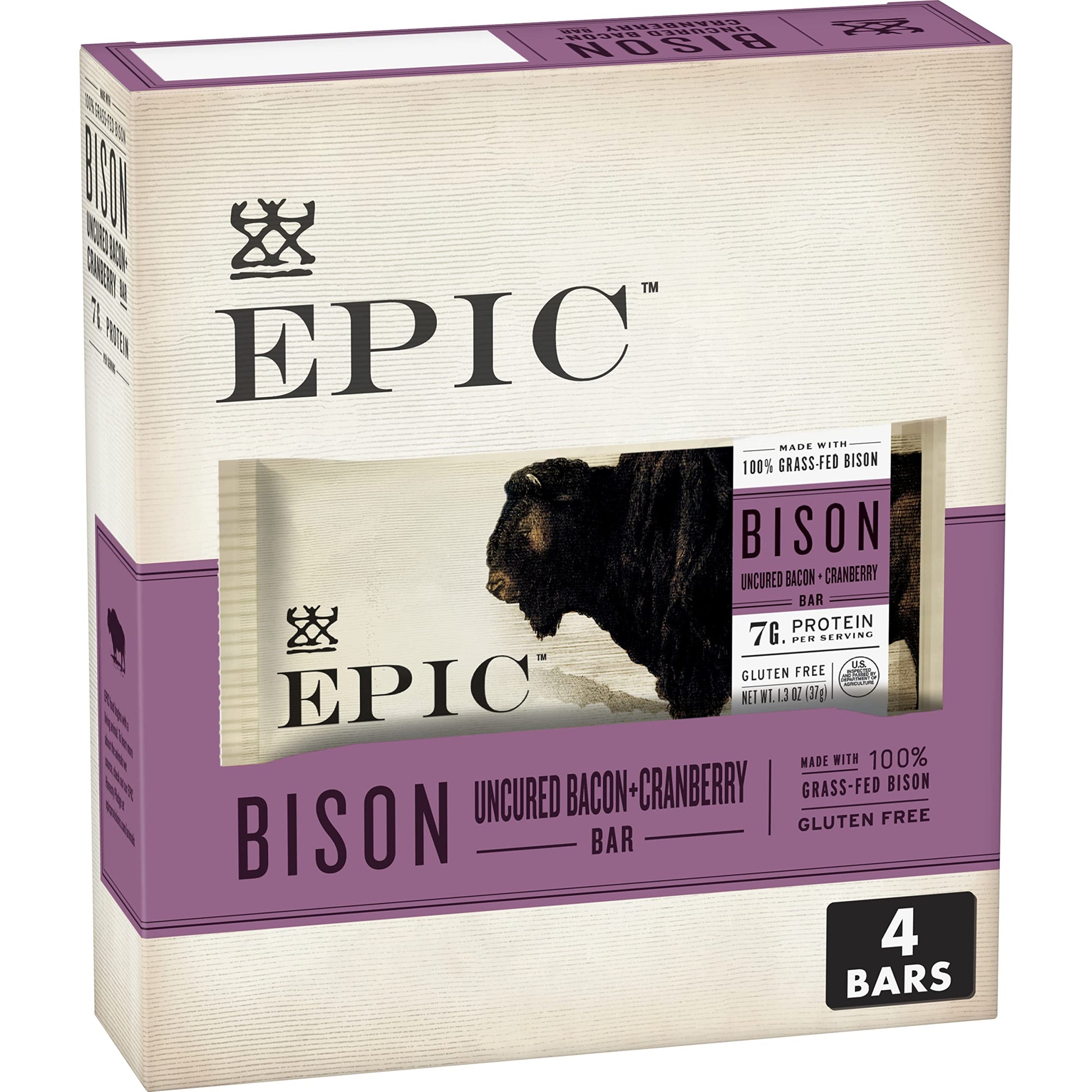 Q: What are the main ingredients in EPIC Bison Bacon Cranberry Bars?A: EPIC Bison Bacon Cranberry Bars are made from 100% grass-fed bison, uncured bacon, and tart cranberries, providing a delicious blend of flavor and nutrition.