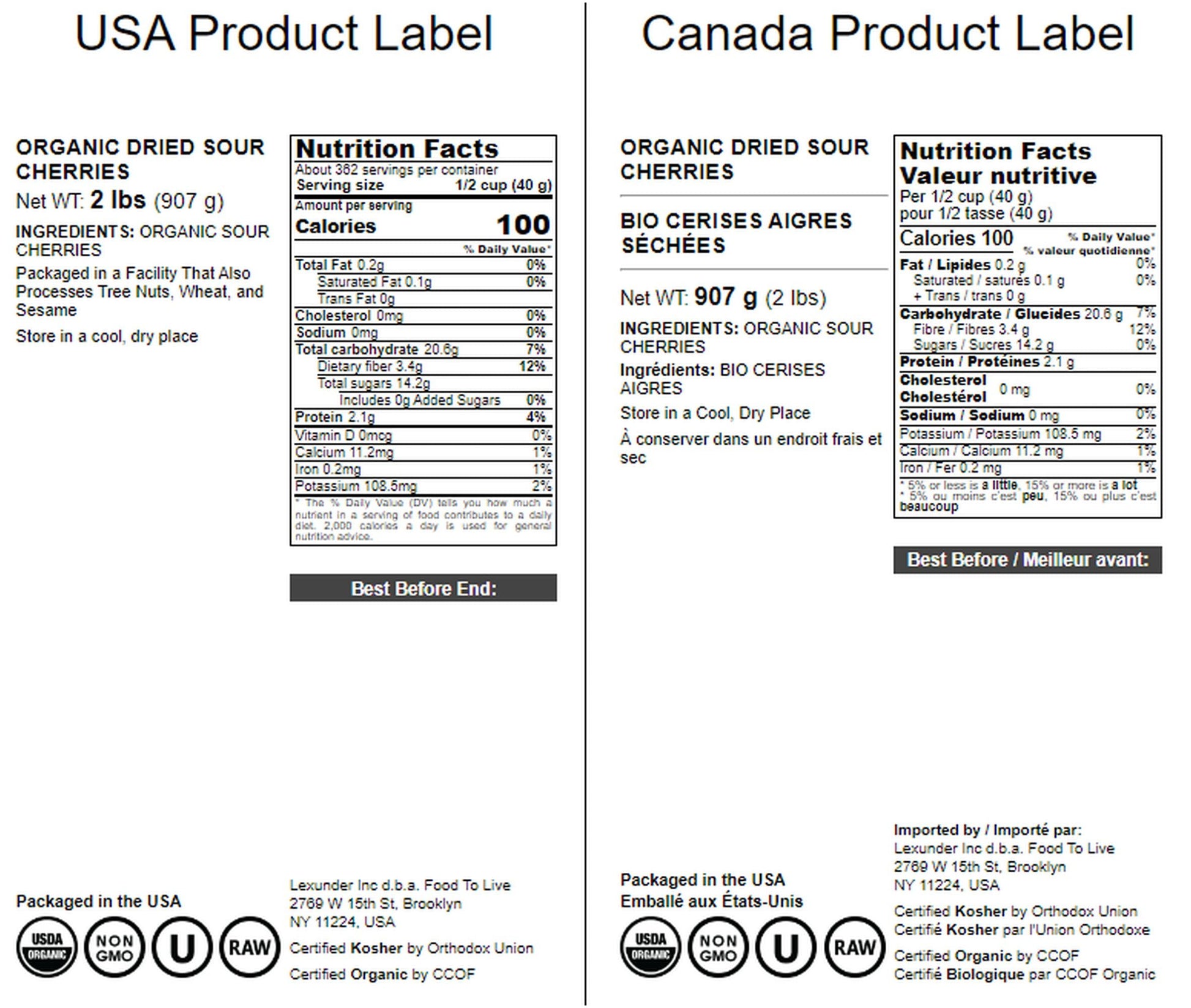 - Q: How can I use Food to Live Organic Dried Unsweetened Sour Cherries in recipes? A: These versatile dried cherries can be used in various recipes. They are perfect for baking in muffins or pies, adding to salads, mixing into granola, or using as a topping for oatmeal and yogurt. Their bold, tart flavor enhances both sweet and savory dishes.