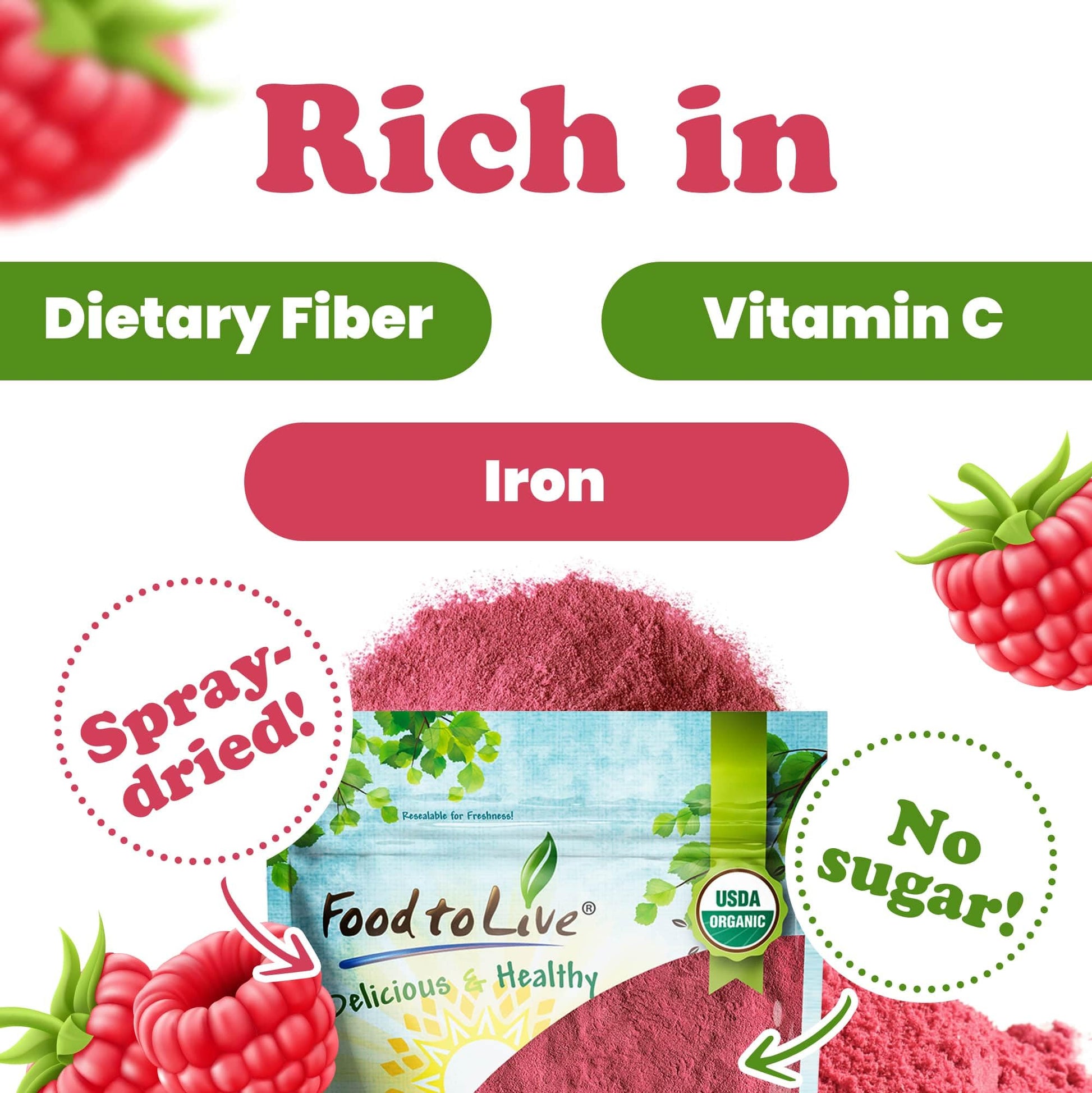 Q: Can I use raspberry powder in smoothies and juices?A: Yes, you can easily incorporate Food to Live Organic Raspberry Powder into your smoothies and juices for a delicious raspberry flavor and added nutrients.