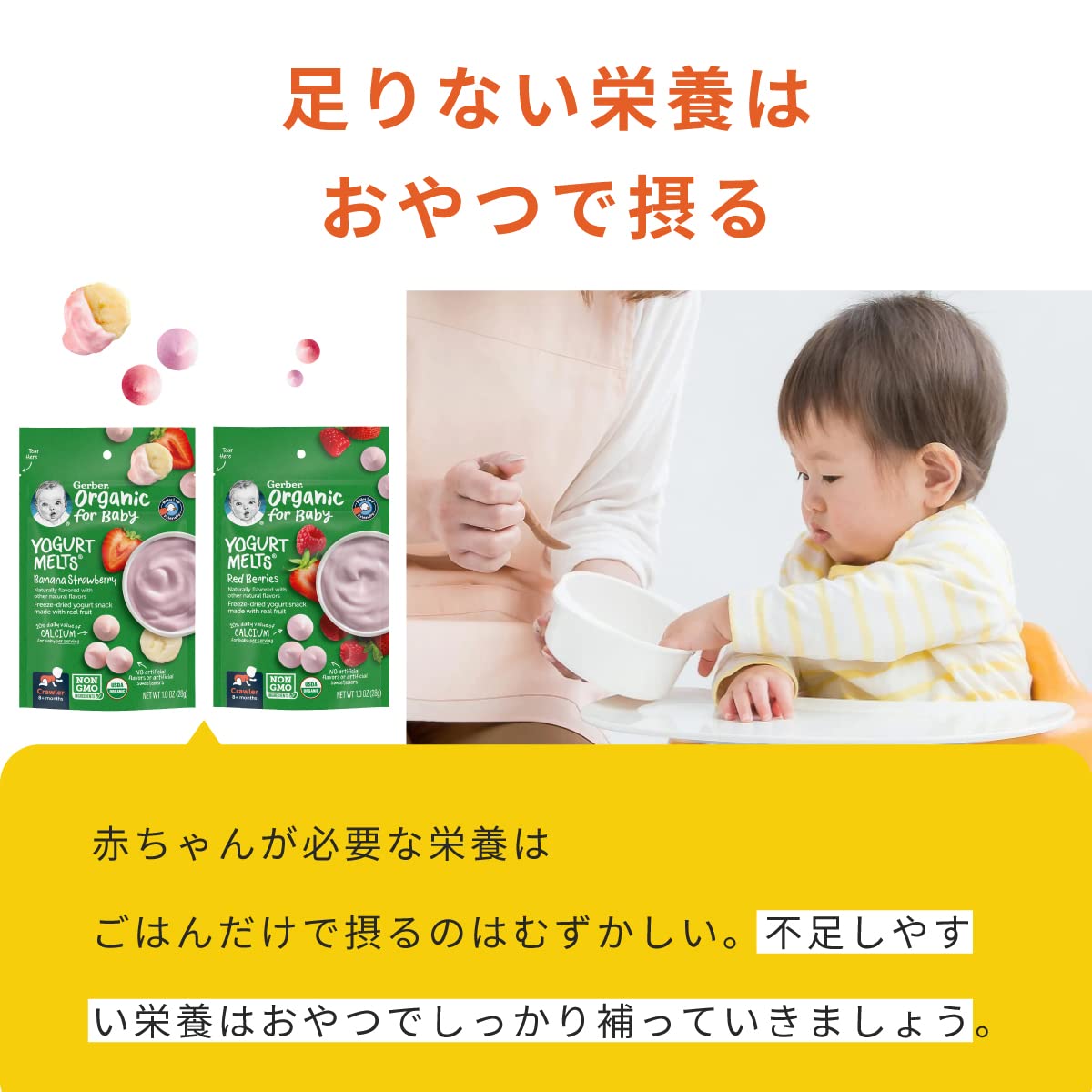 - Q: What are Gerber Baby Snacks Organic Yogurt Melts made of? A: Gerber Baby Snacks Organic Yogurt Melts are made with real organic yogurt and fruit, specifically featuring a delicious banana and strawberry flavor. These snacks do not contain artificial flavors, sweeteners, or preservatives, making them a wholesome choice for your little one.