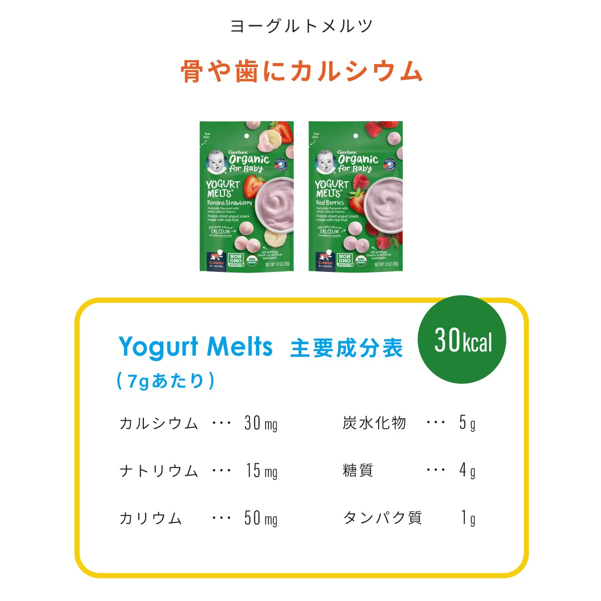 - Q: What is the nutritional value of Gerber Yogurt Melts? A: Gerber Yogurt Melts are made with organic ingredients and provide a tasty snack option that parents can feel good about. Each yogurt bite is crafted to deliver a balance of flavor and nutrition, ensuring your little one enjoys a healthy treat.