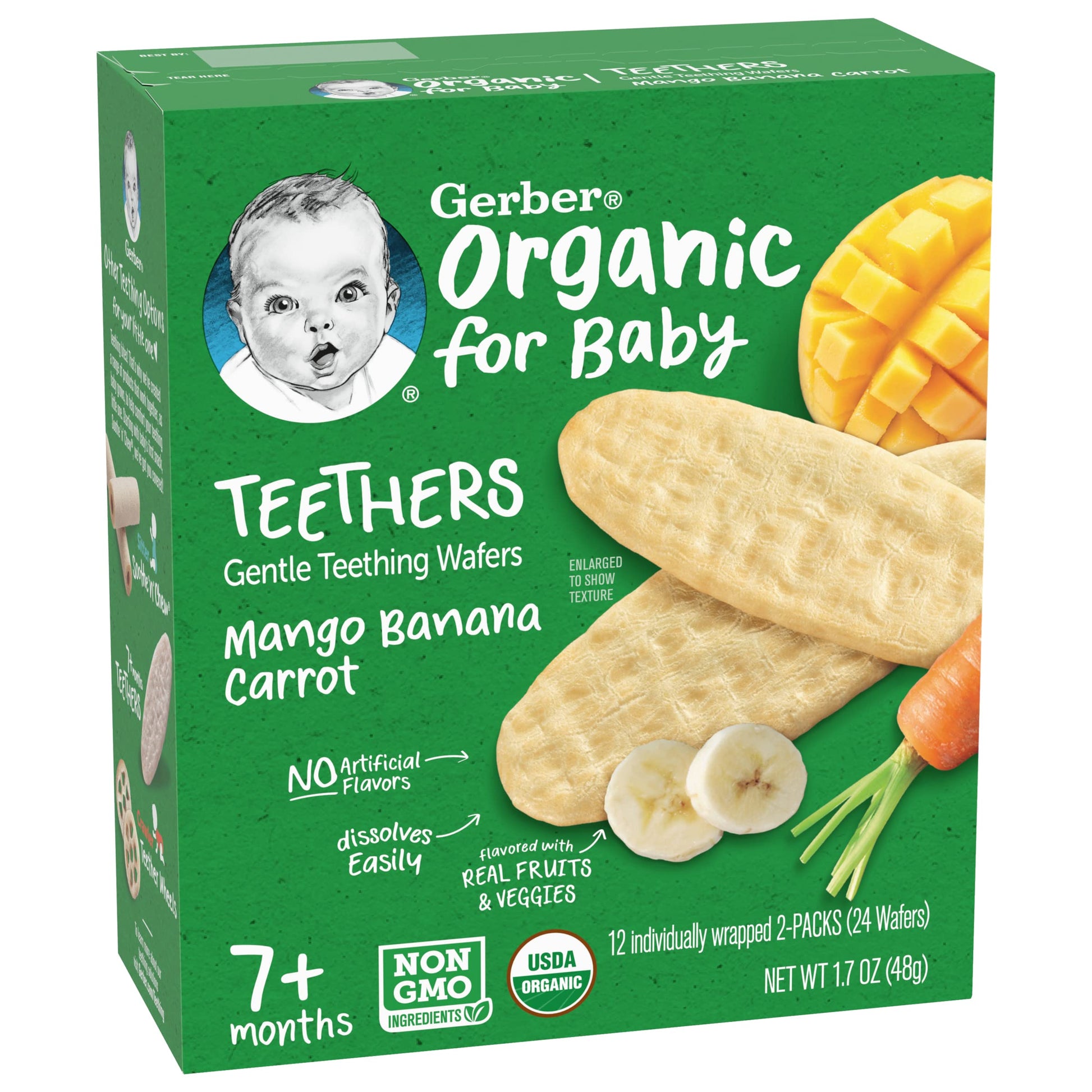 Gerber Organic For Baby Teethers, Mango Banana Carrot, 12 Individually Wrapped 2-Packs Per Box: Usda Organic & Non-Gmo Ingredients, Gentle Teething Wafers For Babies 7+ Months. Gives Gentle Teething Comfort: Teething Is A Tough Job And Can Be Frustrating For Your Little One. Our Organic Wafers Are Crafted To Gently Massage & Soothe Baby'S Gums. Perfectly Shaped For Little Ones To Grasp On Their Own And Dissolve Without A Mess. Make Snack Time Yummy: Gerber Organic Teethers Are Deliciously Flavored With Real Fruits, Juices, & Veggies. They'Re Baked, Non-Gmo, And Without Artificial Sweeteners, Flavors, Or Colors. Happy Snacking, Baby! Organic On-The-Go: Baby'S Need For Teething Doesn'T Stop Even When You'Re On-The-Go. Our 12 Individually Wrapped 2-Packs Are Easy To Carry So Your Little One Can Satisfy Their Teething Gums. Flavored With Real Fruits & Veggies, Our Organic Teethers Are Perfect For Babies 7+ Months Old. Your Baby May Be Ready For Teethers If They: Begin To Show Interest In Crawling; Begin To Self-Feed With Fingers; Mash Food With Up And Down Jaw Motion; Have Been Exposed To Foods Other Than Breastmilk Or Formula.