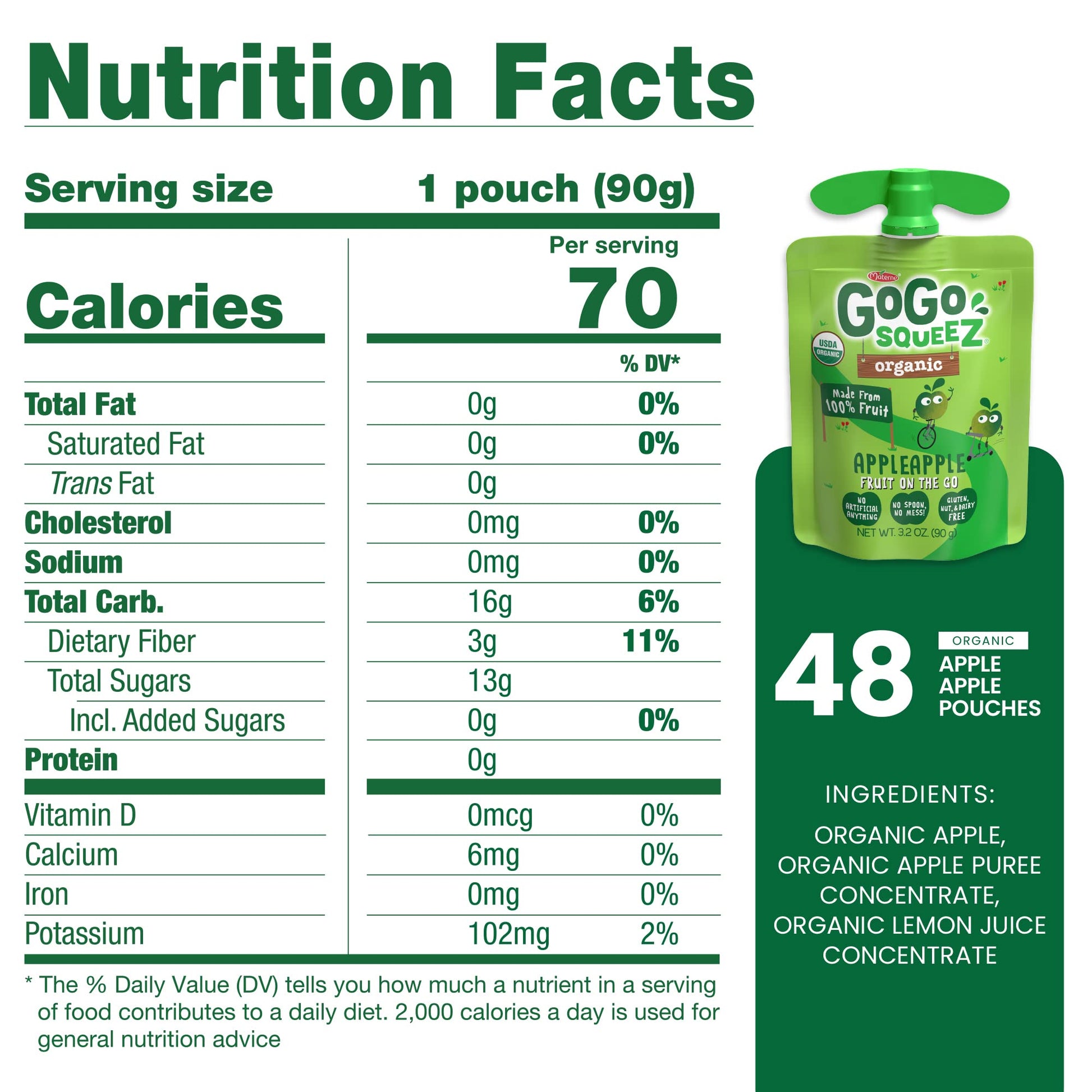 Gogo Squeez Organic Apple Apple Applesauce Snack Pouches Are Jammed Packed With Apples And A Ton Of Yumminess, For A Tasty Snack Anytime, Anywhere. An Organic Twist On The Original, Gogo Squeez Organic Apple Apple Is A Portable, Delicious, Organic Applesauce In A Pouch. These Unsweetened Applesauce Snacks Are Made From 100% Fruit With No High Fructose Corn Syrup (Hfcs), No Added Colors Or Flavors And No Sugar Added.* All That Lip-Smacking Fruit In A No-Fuss, No-Mess Applesauce Snack Pouch! At Gogo Squeez, Were More Than Just Applesauce Pouches! We Craft Our Products With High-Quality Ingredients To Provide Wholesome Goodness For Squeezing And Enjoying Wherever Life Takes You. Gogo Squeez Unsweetened Fruit Snacks Are Non-Gmo Project Verified, Gluten Free, Nut Free, Dairy Free, And Kosher Certified. Our Products Are Free Of Common Allergens, So You, Your Kids, And The Whole Family Can Enjoy Snacks From Gogo Squeez With Confidence And Share Without Worry. Our Pouches Are Bpa Free And Feature Easy-Open Caps And A Built-In Straw. No Spoon, And No Mess! *Not A Low Calorie Food. See Nutrition Facts For Sugars And Calorie Content.