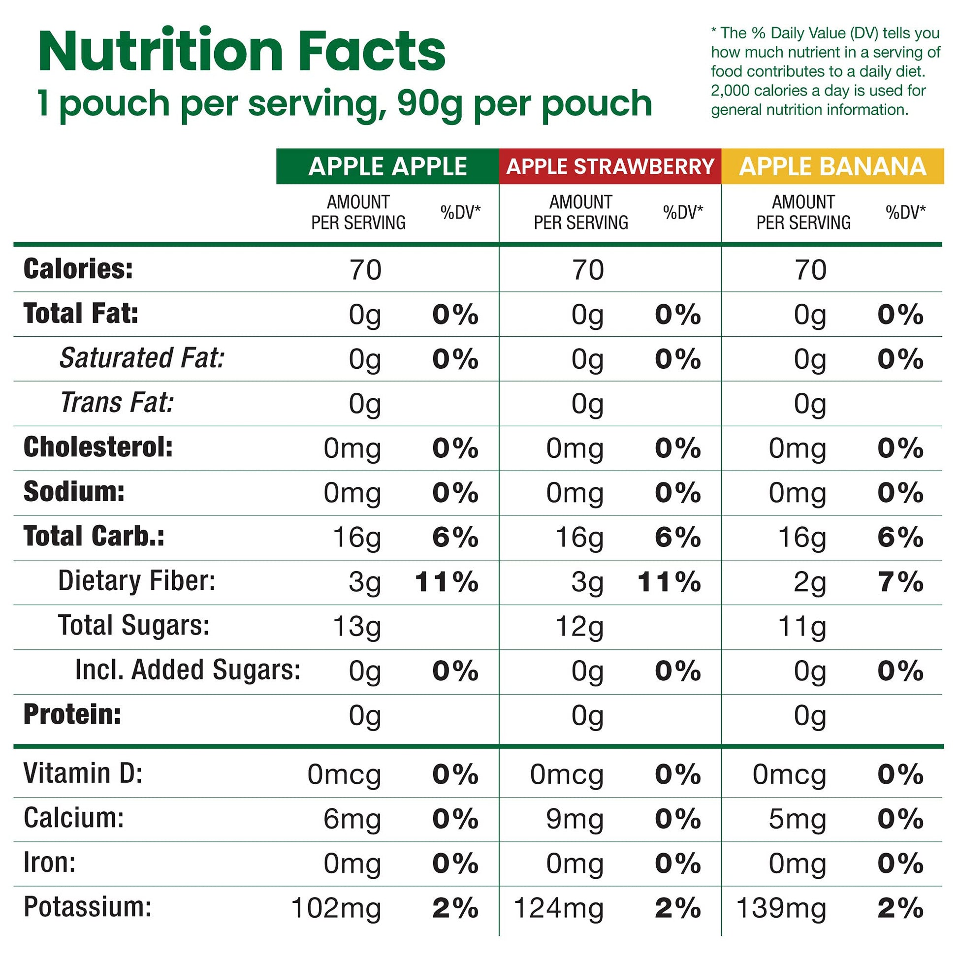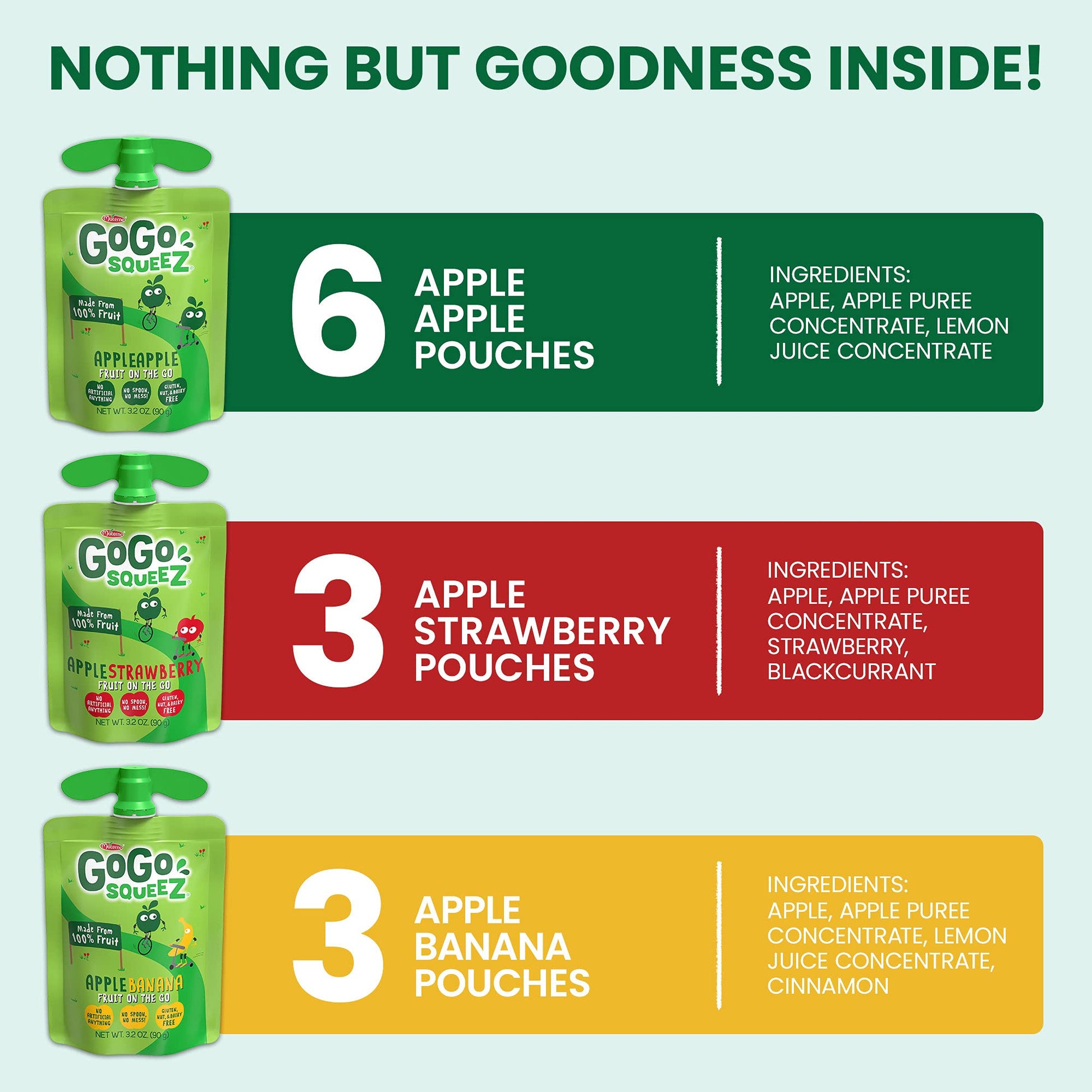 Gogo Squeez Fruit On The Go Variety Pack, (6) Apple Apple, (3) Apple Banana & (3) Apple Strawberry, Applesauce Snack Pouches Are A Tasty Snack Anytime, Anywhere. Gogo Squeez Apple Apple Is Our Signature Applesauce Flavor; Apple Banana Is The Perfect Combination Of Apples & Bananas; Gogo Squeez Apple Strawberry Is Jammed Packed With Apples, Strawberries And Yumminess. These Unsweetened Apple And Fruit Snacks Are Made From 100% Fruit With No High Fructose Corn Syrup (Hfcs), No Added Colors Or Flavors And No Sugar Added.* All That Lip-Smacking Fruit In A No-Fuss, No-Mess Applesauce Snack Pouch! At Gogo Squeez, Were More Than Just Applesauce Pouches! We Craft Our Products With High-Quality Ingredients To Provide Wholesome Goodness For Squeezing And Enjoying Wherever Life Takes You. Gogo Squeez Unsweetened Fruit Snacks Are Non-Gmo Project Verified, Gluten Free, Nut Free, Dairy Free And Kosher Certified. Our Products Are Free Of Common Allergens, So You, Your Kids And The Whole Family Can Enjoy Snacks From Gogo Squeez With Confidence And Share Without Worry. Gogo Squeez Gets Its Sweetness From The Fruit Inside. Our Pouches Are Bpa Free And Feature Easy-Open Caps And A Built-In Straw. No Spoon, And No Mess! *Not A Low Calorie Food. See Nutrition Facts For Sugars And Calorie Content.