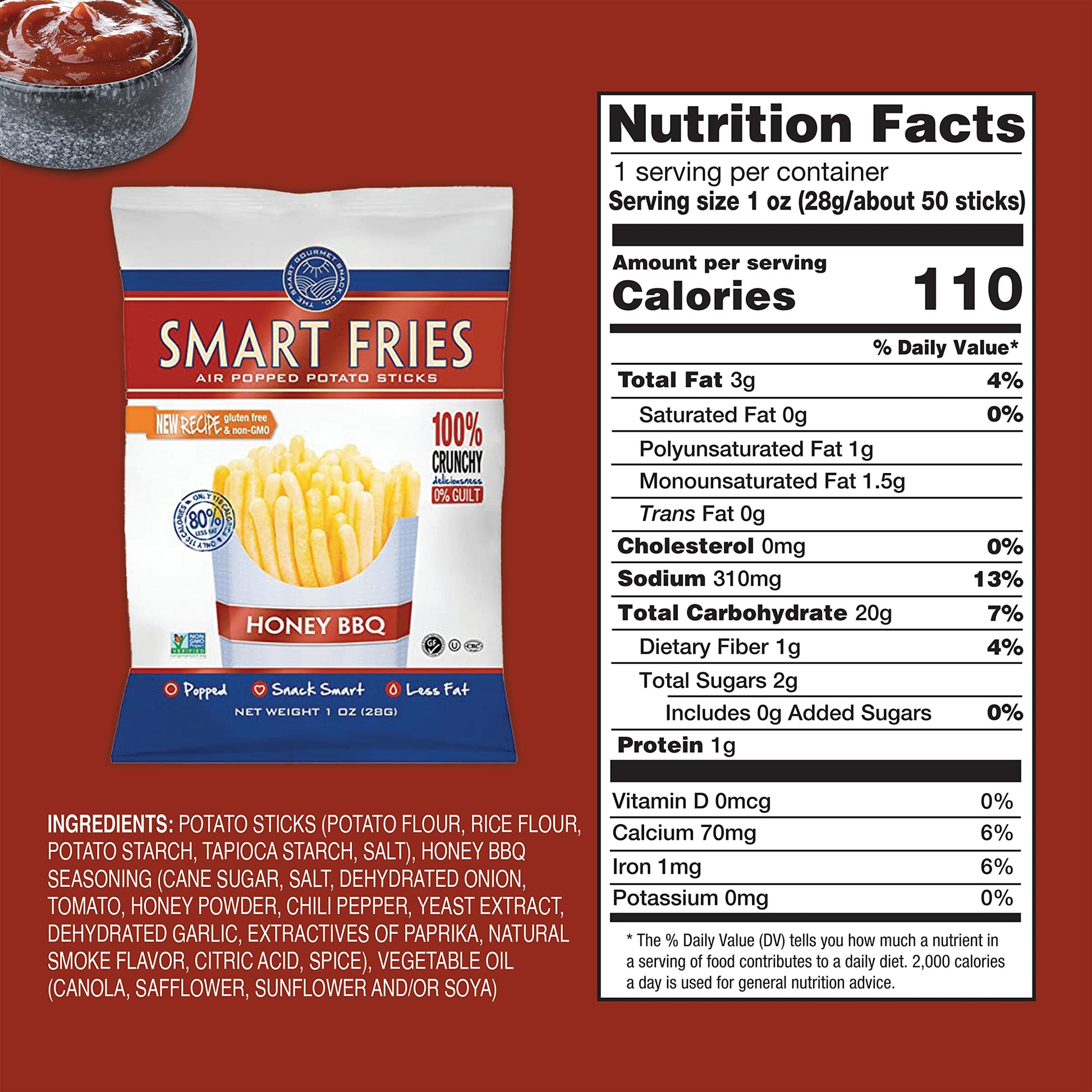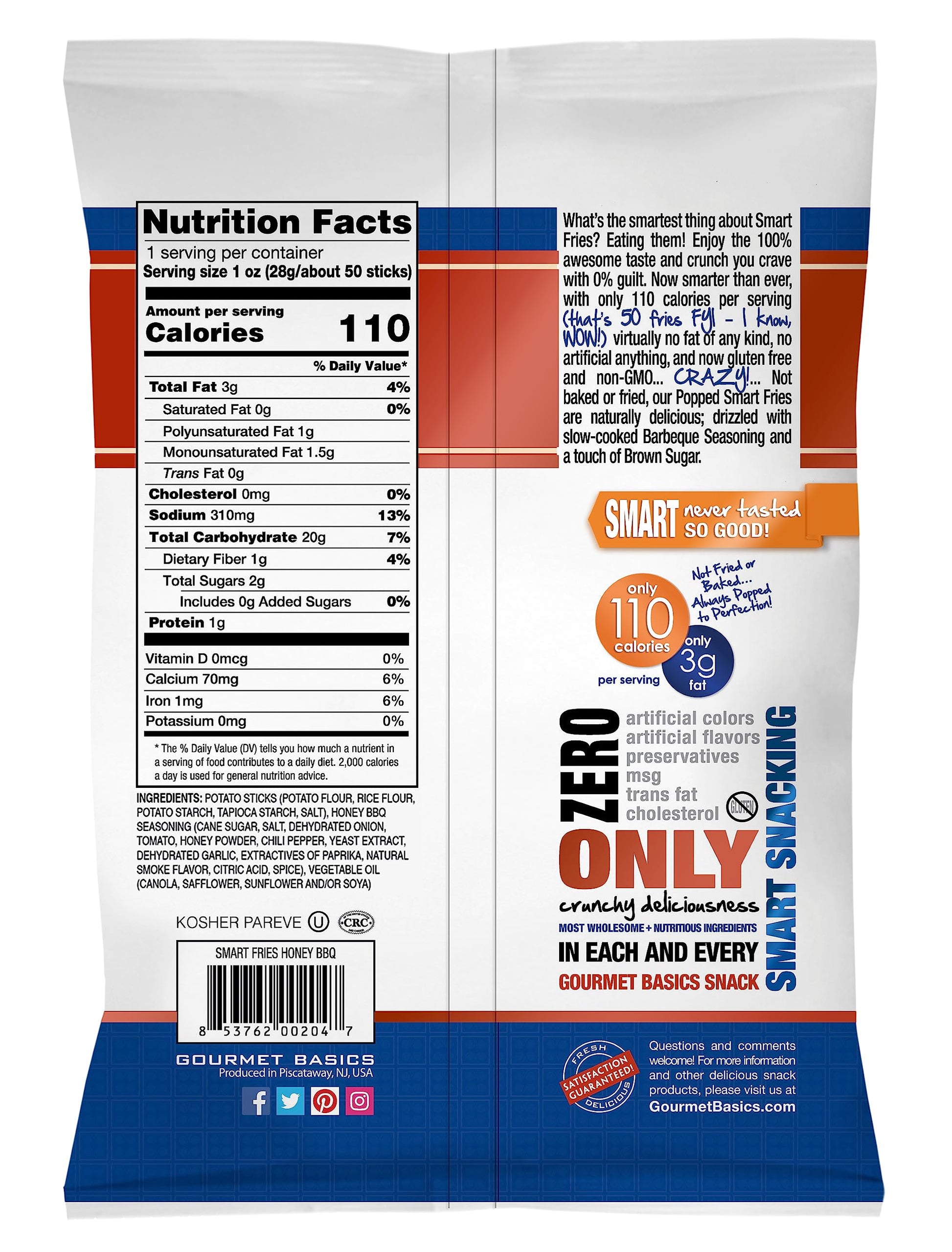 What'S The Smartest Thing About Smart Fries? Eating Them! Enjoy The 100% Awesome Taste And Crunch You Crave With 0% Guilt. Now Smarter Than Ever, With Only 100 Calories Per Serving (That'S 50 Fries Fyi-I Know, Wow!), Virtually No Fat Of Any Kind, No Artificial Anything, And Now Gluten Free And Non-Gmo...Crazy!...Not Baked Or Fried, Our Popped Smart Fries Are All Natural, Seasoned With The Famous Slow-Cooked Kansas City Barbeque Flavor: Savory, Sweet And Smoky. Smart Fries Are 100 Calories With Only 2 Grams Of Fat Per Serving And Are 100% Natural With No Artificial Additives, No Msg, And 0G Trans And 0G Saturated Fats. Our Heart Healthy Promise: >0 Grams Trans Fat, >0 Cholesterol >No Artificial Colors >No Artificial Flavors >No Preservatives >No Msg. >Gluten Free >Gmo Free Original Kc Bbq Smart Fries Are Certified Ou Kosher Pareve & Guaranteed Fresh & Delicious. Package Dating: Product Guaranteed Fresh For At Least 90 Days From Date Of Purchase.