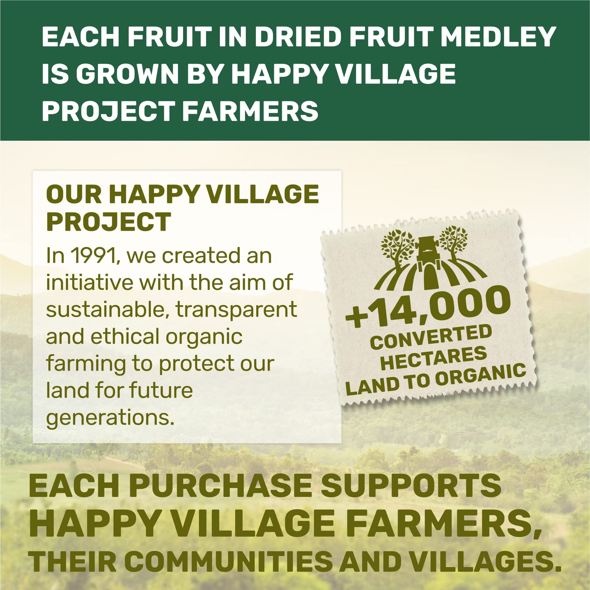 Q: What makes Happy Village's dried fruit unique?A: Happy Village's dried fruit is unique because it is part of the 'Happy Village Project,' which supports sustainable farming practices and directly benefits the farmers and their communities.