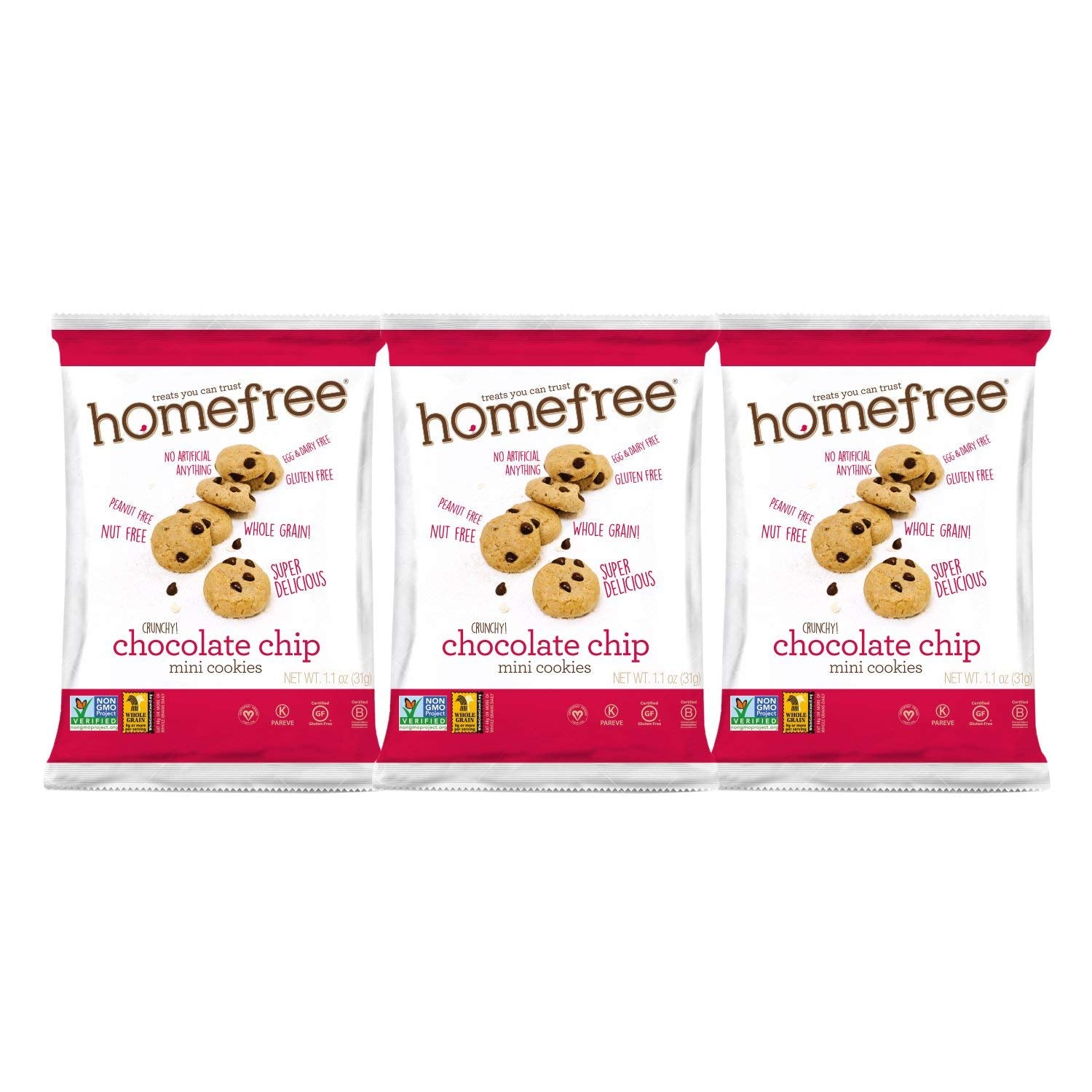 Chocolate Chip Mini Cookies 30 Pack: Parents know that what kids eat, matters; That's why we created delicious and nutritious snacks that nearly everyone can enjoy; Perfect on-the-go treat for school lunches, parties, play dates & field trips | Kids of All Ages Say Yum: Even picky eaters agree that Homefree's gluten-free cookies taste great and make a delicious, healthy school snack | Leave No Bellies Behind: Stock your pantry with cookie snack packs ready for guests who want a nut free snack, gluten free snack or vegan dessert; Made in a dedicated Nut Free, Peanut Free, Dairy Free, Gluten Free bakery; Kosher Pareve and Vegan | Nutrition That Counts: Nourish little bodies with wholesome Non-GMO ingredients including whole grains; Each snack pack is pre-portioned & contains 140 calories | School Safe Snack: Send single serve bags as school snacks and safely include the kids with peanut and nut allergies and other dietary needs