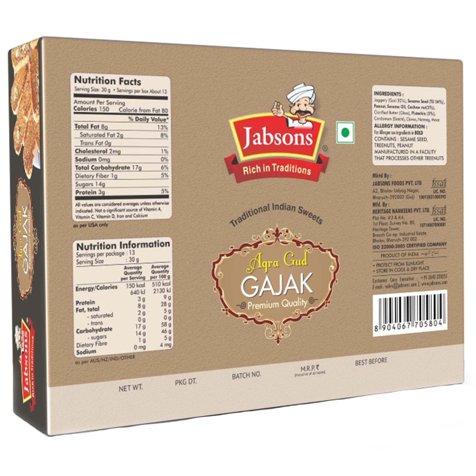 Q: What are the main ingredients in Jabsons Agra Gud Gajak?A: Jabsons Agra Gud Gajak primarily contains jaggery (55%), sesame seeds (30%), peanuts, sesame oil, clarified butter (ghee), cashew nuts (3%), pistachios (1.5%), along with cardamom, clove, mace, and nutmeg, making it a rich and flavorful traditional snack.