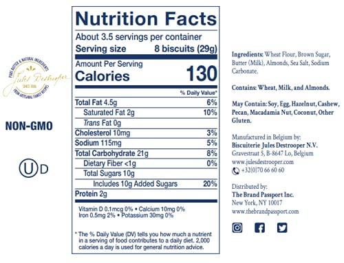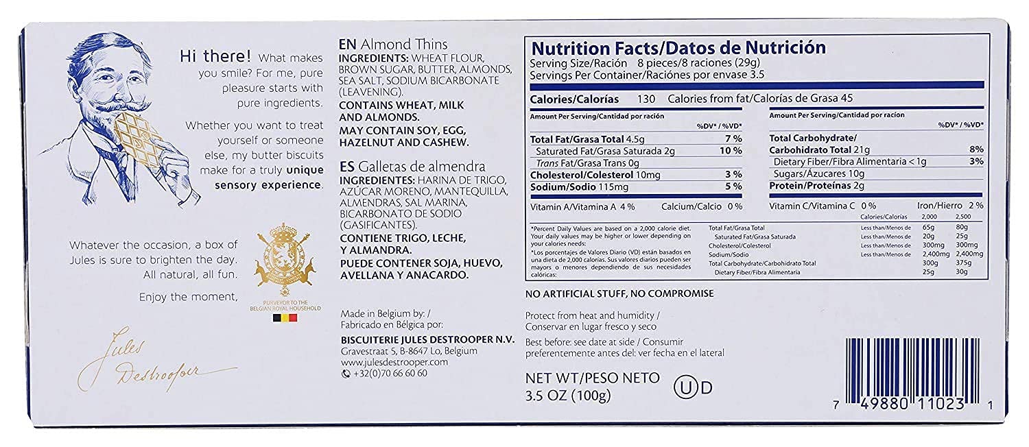 Q: What are Jules Destrooper Almond Thins made of?A: Jules Destrooper Almond Thins are crafted using the finest natural ingredients, including pure butter, brown sugar, and real Valencian almonds, ensuring a delightful taste and texture.
