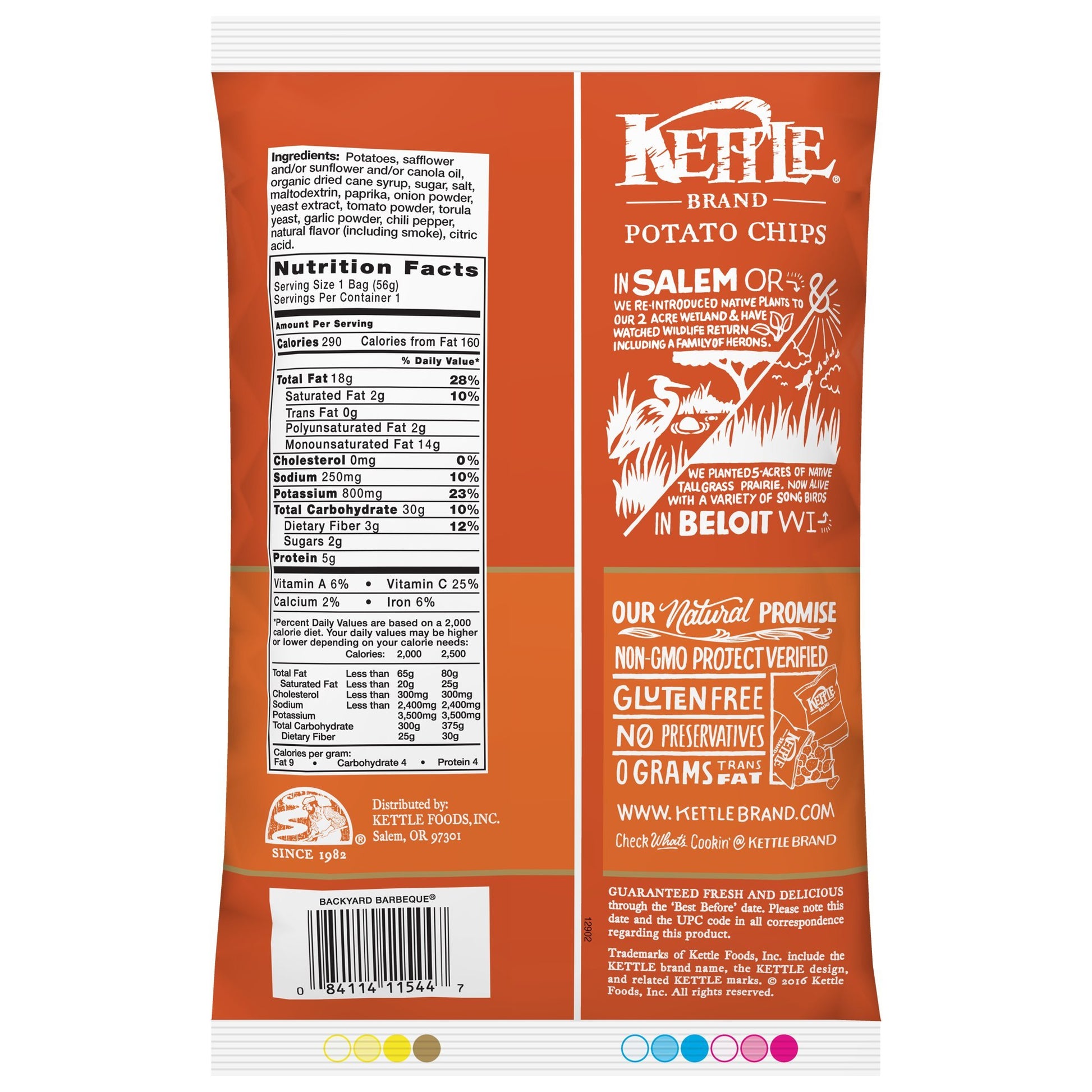Kettle Brand Backyard Barbeque kettle chips start with a search for undisputed potato excellence. Determined not to disrupt the flawless, spudsy goodness, these beauties are cooked, skin on, one batch at a time and flavored to perfection. Everyone loves the taste of Kettle Backyard Barbeque Chips – smoky, spicy, tangy, and sweet. These potato chips capture the sublime vibe of a summertime barbeque, then throw in a hearty crunch that takes them over the top. When you open a bag of our Kettle Brand potato chips, you know you're getting incredible-tasting kettle chips made with authentic recipes by real people. From their farms to our kitchens and then to your home, the time and attention every Kettle Brand worker puts into their products is care you can trust. All that, plus Kettle Brand chips deliver a delicious snack that’s non-GMO Project Verified, and Certified Gluten-Free. These 2-ounce snack bags of kettle chips are great at home or on-the-go. Kettle Brand potato chips. Extra in a good way.
