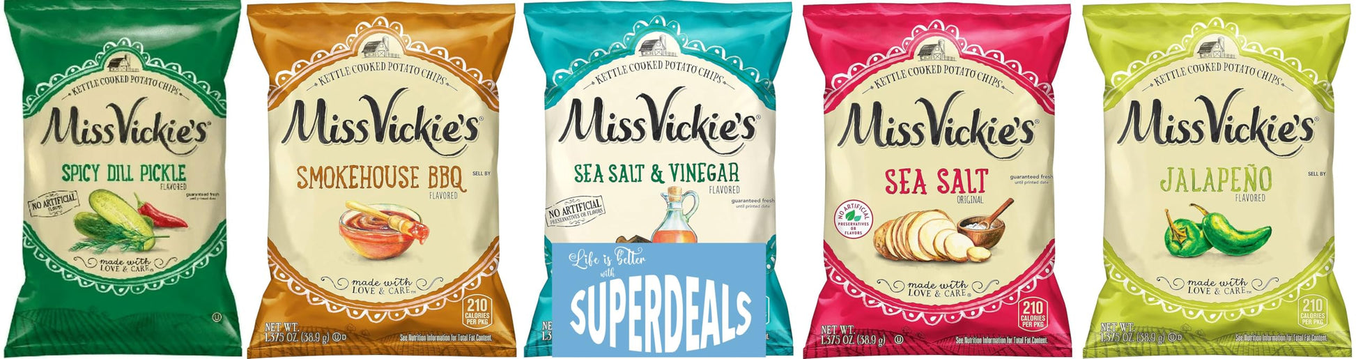 - Q: What flavors are included in the Miss Vickie's Kettle Cooked Potato Chips Variety Pack? A: The Miss Vickie's Kettle Cooked Potato Chips Variety Pack includes five delicious flavors: Sea Salt, Sea Salt & Vinegar, Smokehouse BBQ, Jalapeno, and Spicy Dill Pickle. Each pack contains 6 bags of each flavor, totaling 30 bags.