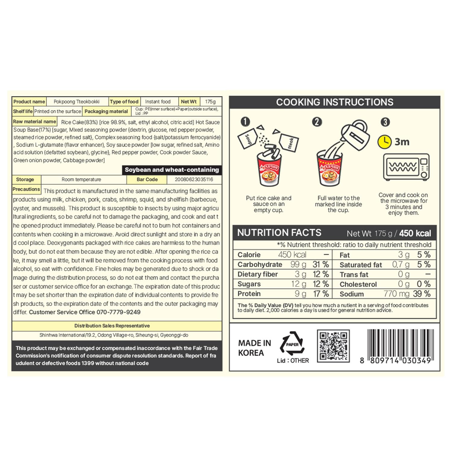 Q: What is Pokpoong Tteokbokki and how is it prepared?A: Pokpoong Tteokbokki is a traditional Korean street food made with chewy rice cakes and a sweet and spicy sauce. To prepare, simply open the cup, add the rice cakes and sauce, pour in water, mix well, and microwave for 2 minutes and 30 seconds.
