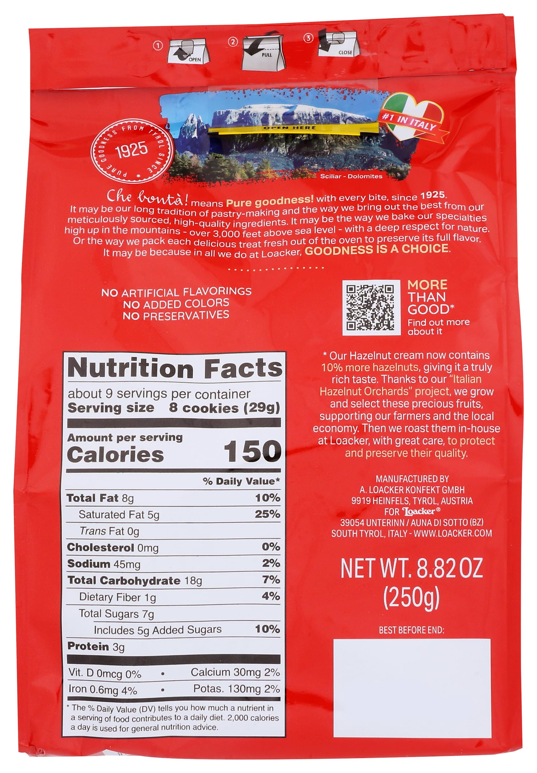 Q: What is the size and weight of the Loacker Quadratini Hazelnut Wafer Cookies pack?A: The Loacker Quadratini Hazelnut Wafer Cookies come in a large snack bag that weighs 250 grams (8.82 ounces), providing plenty of delicious cookies for you to enjoy.