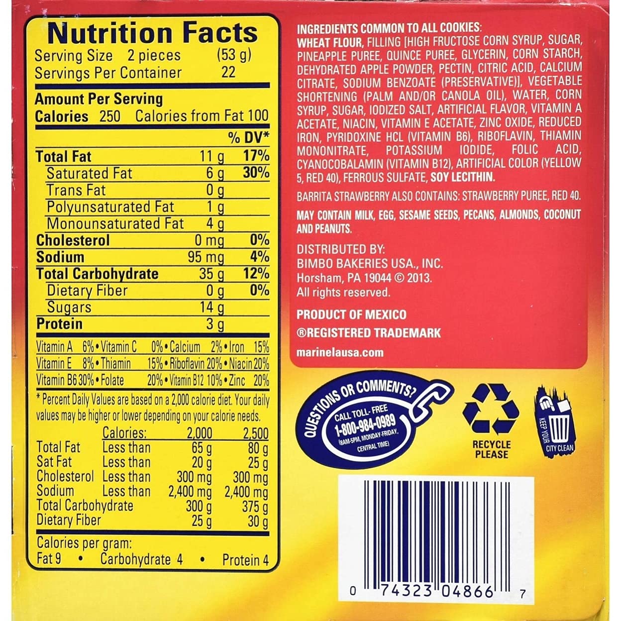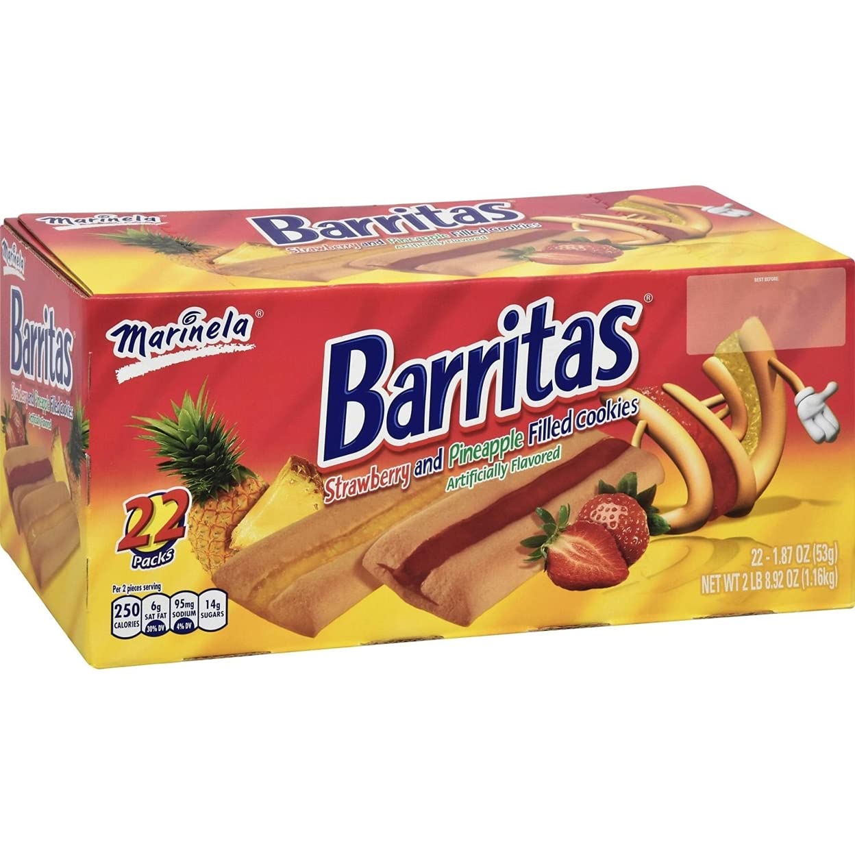 Q: What flavors do Marinela Barritas come in?A: Marinela Barritas are available in two delicious flavors: Pineapple and Strawberry. Each pack contains 22 cookies filled with each flavor.