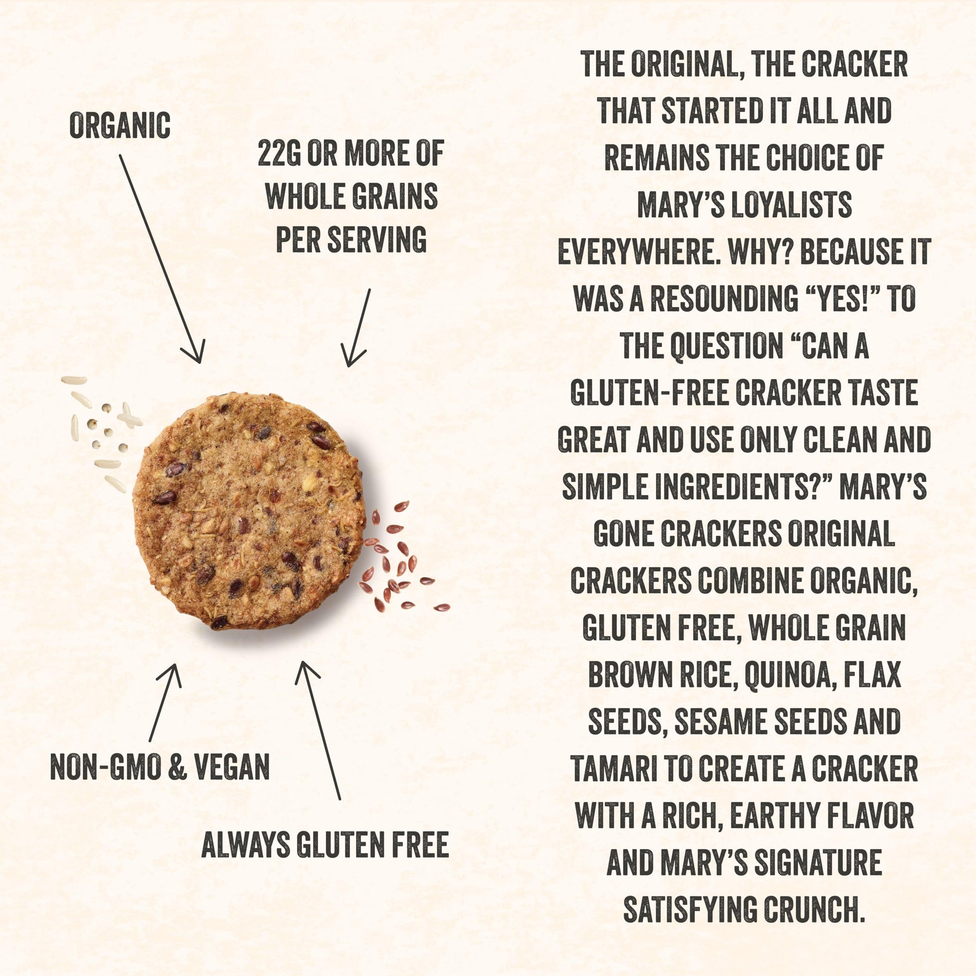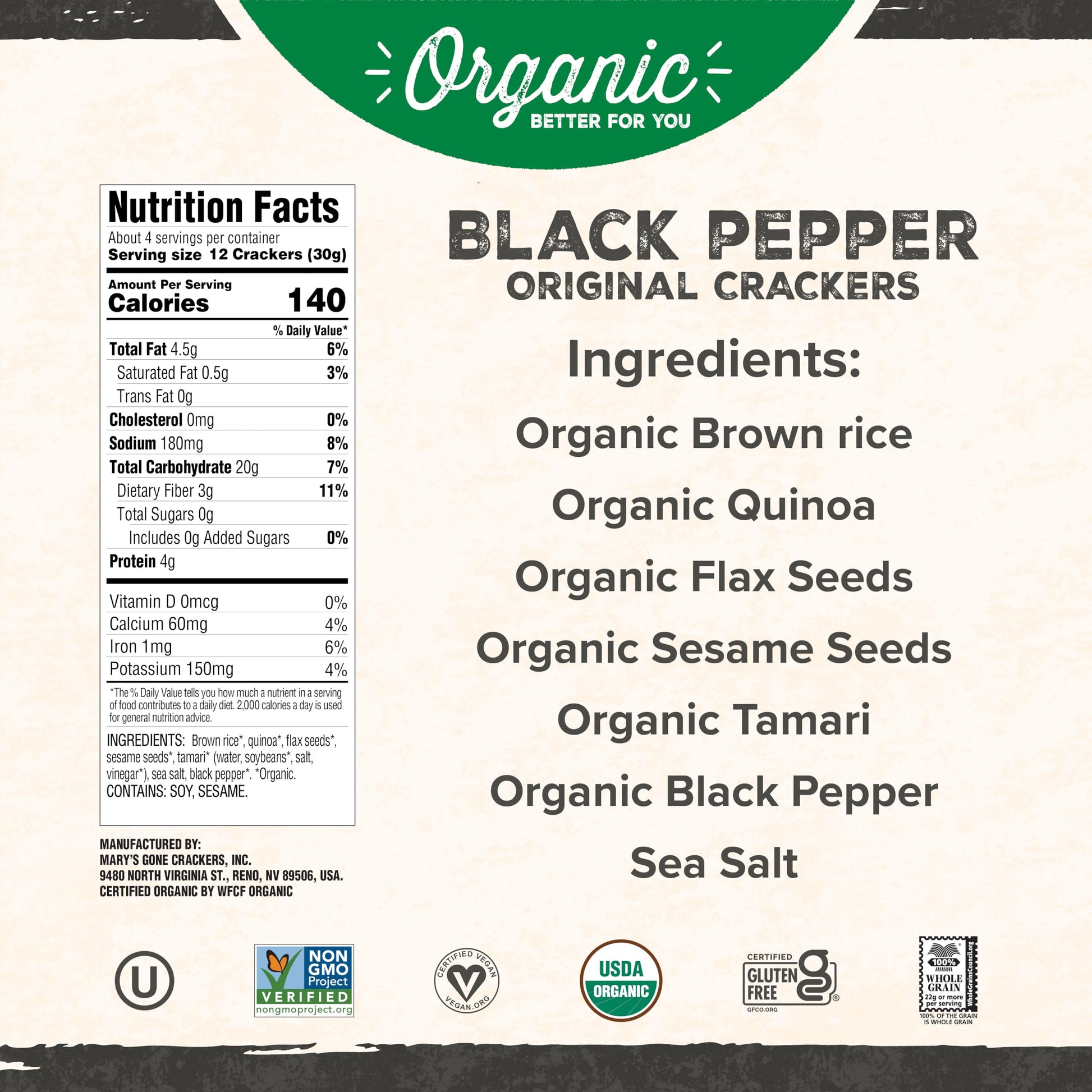 Better-For-You: Certified Organic, Gluten-Free, Non Gmo, Vegan, Whole Grain And Kosher; Our Crackers Meet The Highest Standards For Quality And Dietary Preferences | Ingredients: Mary'S Gone Crackers Products Are Always Made With Simple, Clean, And Organic Ingredients | Bakery Details: Manufactured In Our Own Organic, Gluten Free, Vegan, Nut Free And Kosher Bakery. We Aim To Ensure Freshness And Quality In Every Bite. | Nutrients: Mary'S Gone Crackers Original Crackers Are 100% Whole Grain - Containing 22G Of Whole Grains Or More In Every Serving. | Flavor: Our Black Pepper Original Crackers Give You The Same Crunch You Love From Our Original Crackers While Adding In The Bold Flavor Of Black Pepper; We Recommend Pairing Them With Sliced Beats + Goat Cheese Or Parmesan Cheese Dip