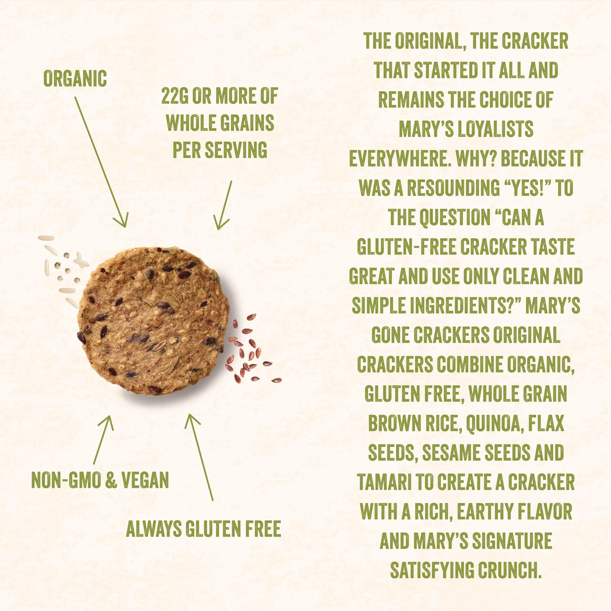 One Box Might Not Be Enough! Our Original Crackers With An Herbaceous Twist. Our Herb Original Crackers Have Everything You Know And Love About Marys Original Crackers Using Our Tried-And-True Clean Simple Ingredients: Gluten Free, Organic, Whole Grain Brown Rice, Quinoa, Flax, Sesame Seeds And Tamari With The Addition Of Aromatic Herbs To Create A Cracker Thats Not Only Rich In Flavor But Also Offers Our Signature Satisfying Crunch.