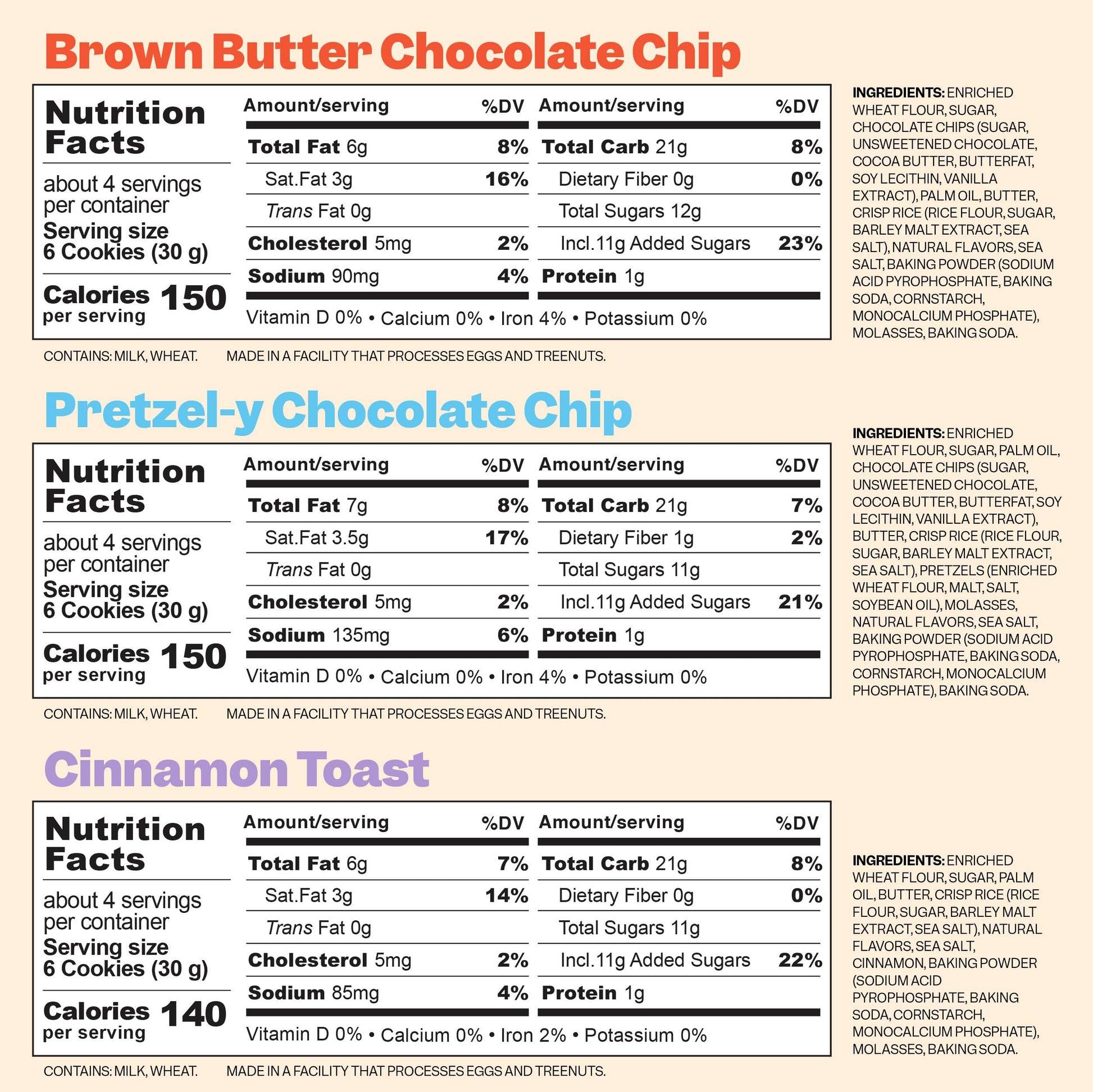 Q: What are the main flavors of the Milk Bar Super Crunchy Cookies?A: The Milk Bar Super Crunchy Cookies come in three delicious flavors: Cinnamon Toast, Pretzel-y Chocolate Chip, and Brown Butter Chocolate Chip. Each flavor offers a unique taste experience, combining crunchy rice cereal with classic cookie ingredients.