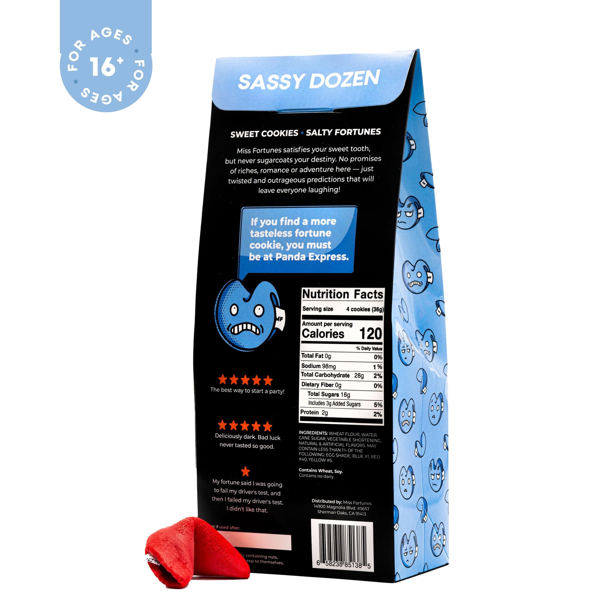 - Q: What makes Miss Fortunes fortune cookies different from regular ones? A: Miss Fortunes fortune cookies are unique because they feature irreverent and humorous messages written by professional comedy writers, making them perfect for those who enjoy a good laugh. Unlike traditional fortune cookies that offer serious predictions, these cookies deliver twisted and outrageous fortunes that will entertain everyone.
