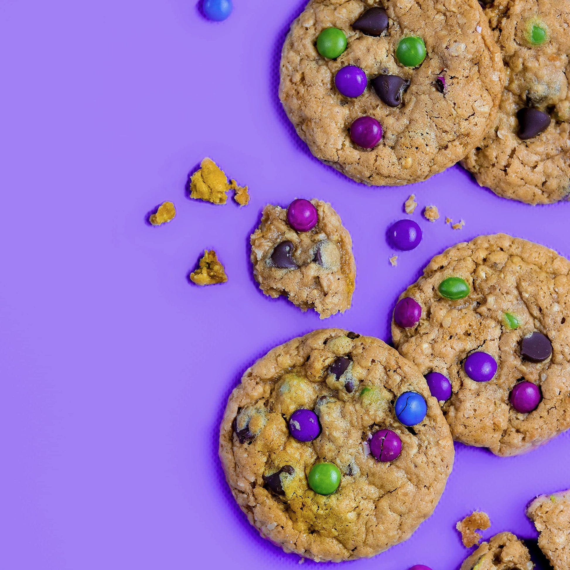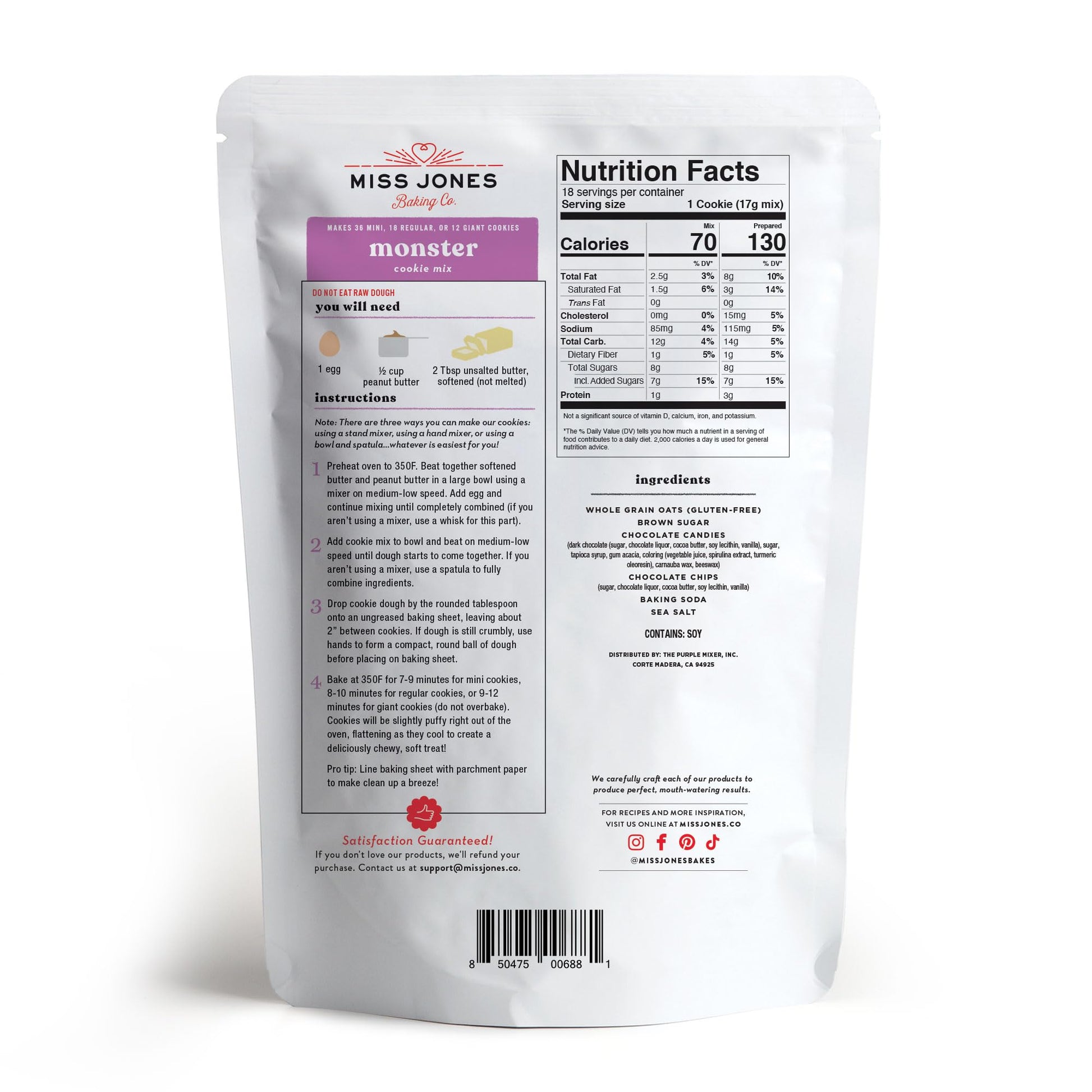 Q: What makes this cookie mix different from other brands?A: Miss Jones Baking Monster Cookie Mix contains more chocolate chips and candies than leading brands, ensuring gooey deliciousness in every bite while being made with 100% whole grain oats.