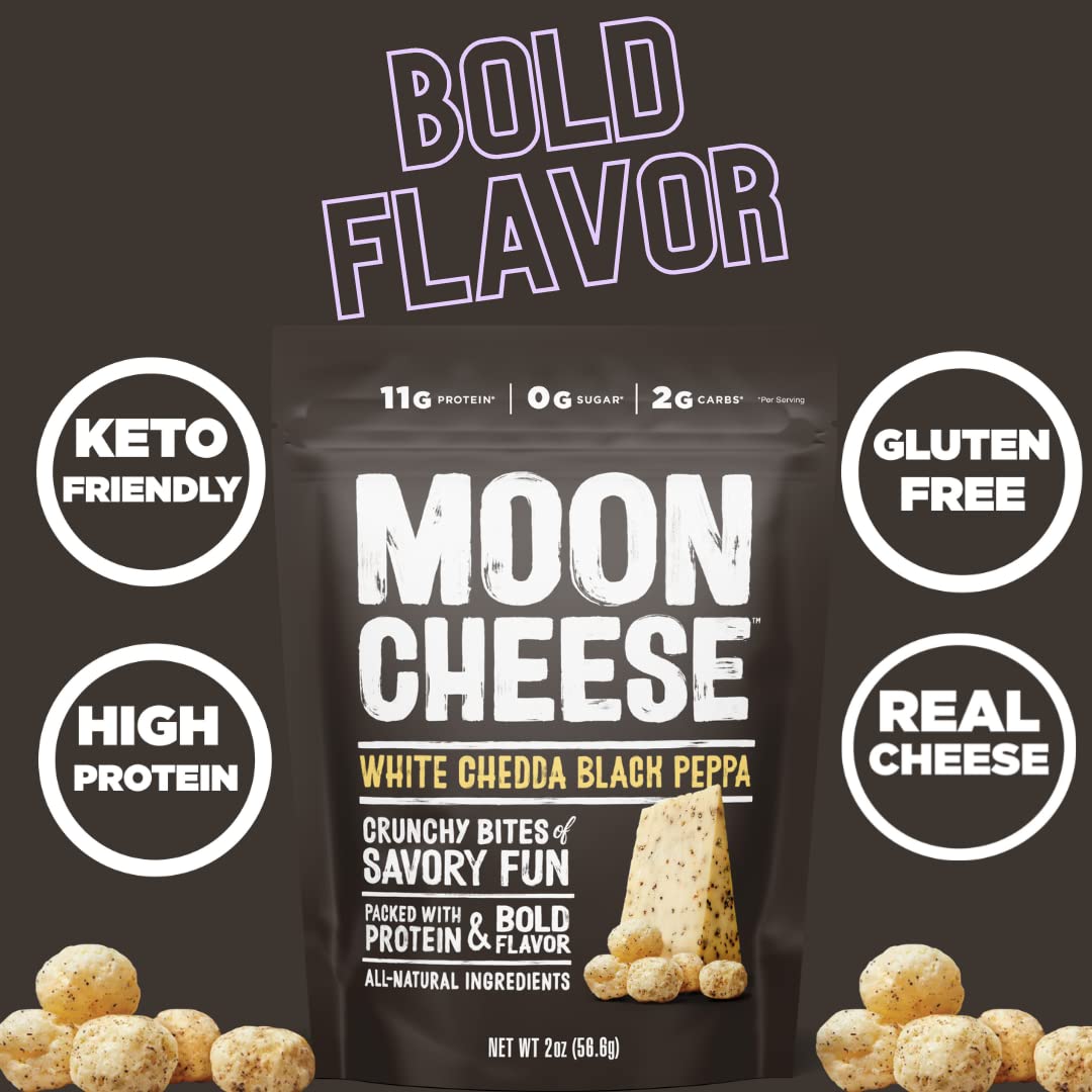 Q: What are Moon Cheese Bites made of?A: Moon Cheese Bites are made from 100% real white cheddar cheese and are sprinkled with savory black pepper, providing a delicious and crunchy snack option.