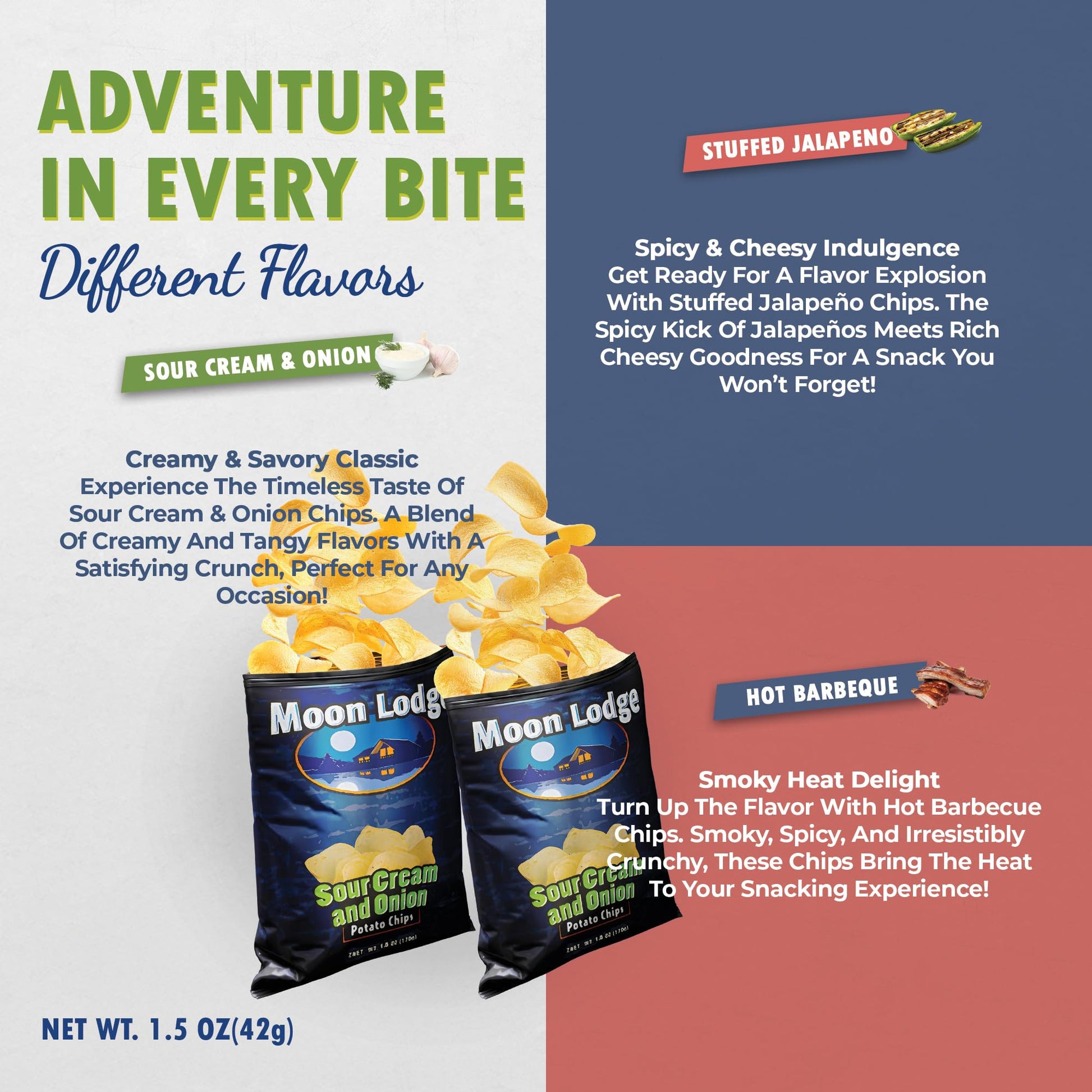 Q: What flavors are included in the Moon Lodge Potato Chips variety pack?A: The Moon Lodge Potato Chips variety pack includes an assortment of delicious flavors such as Buffalo Wing, Blue Cheese, Sour Cream & Onion, Barbeque, Stuffed Jalapeño, and hot chips, ensuring there's something for everyone to enjoy.