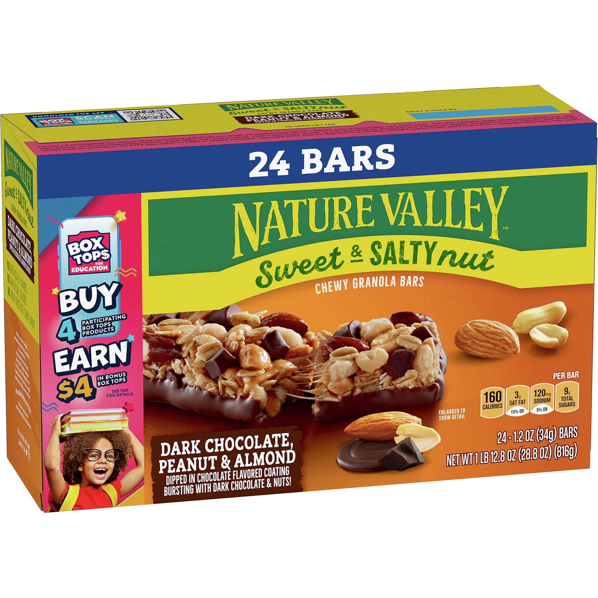- Q: How many granola bars are included in a box of Nature Valley Dark Chocolate Peanut Almond? A: Each box of Nature Valley Dark Chocolate Peanut Almond Chewy Granola Bars contains 24 bars, making it a convenient option for families or individuals who enjoy having snacks readily available.