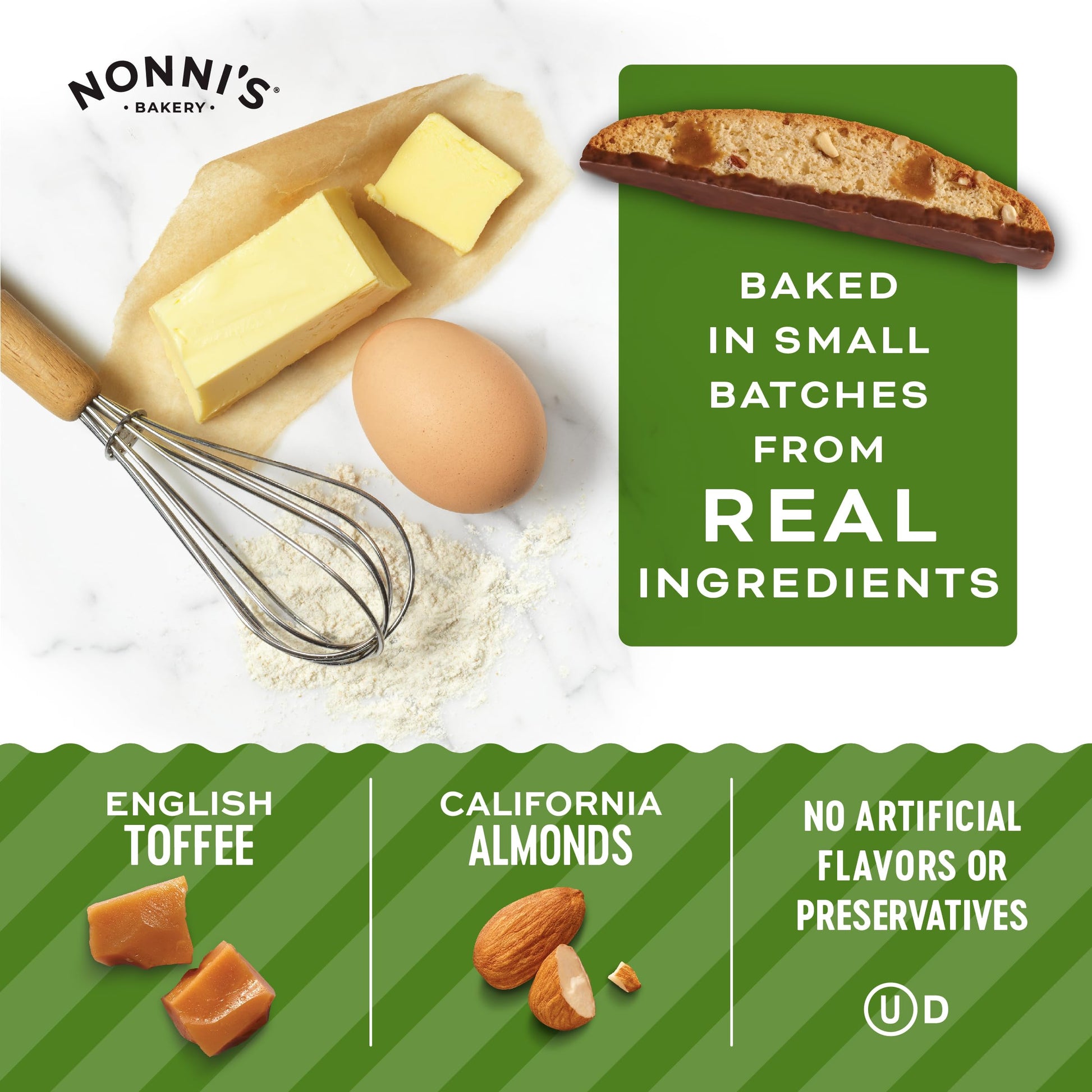 Q: What are the main ingredients in Nonni's Toffee Almond Biscotti?A: Nonni's Toffee Almond Biscotti is made with fresh eggs, pure butter, English toffee bits, and almonds, ensuring a delicious and crunchy texture without any artificial flavors.