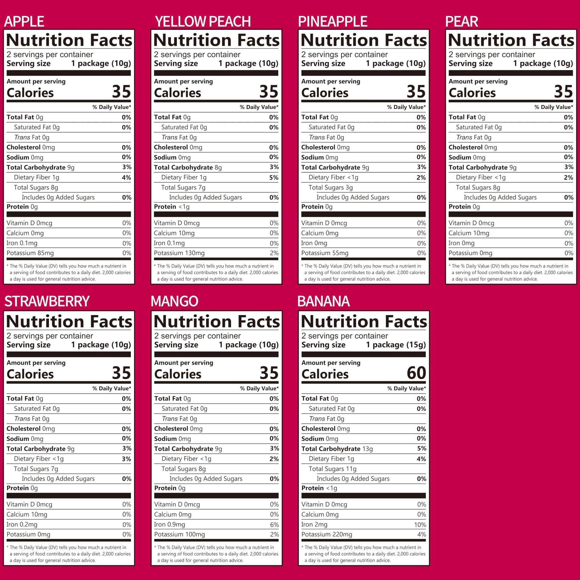 Q: What types of fruit are included in the ONETANG Freeze-Dried Mixed Fruit pack?A: The ONETANG Freeze-Dried Mixed Fruit pack includes a variety of delicious fruits: apples, pineapples, pears, mangoes, bananas, yellow peaches, and strawberries, all packed in convenient single-serve bags.