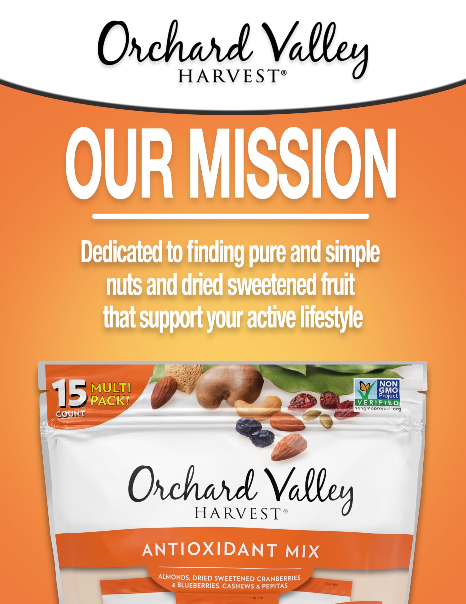 - Q: How can I incorporate Orchard Valley Harvest Antioxidant Mix into my daily routine? A: You can enjoy Orchard Valley Harvest Antioxidant Mix as a quick snack at home, at work, or while traveling. It's perfect for adding to your breakfast yogurt, salads, or as a topping for oatmeal.