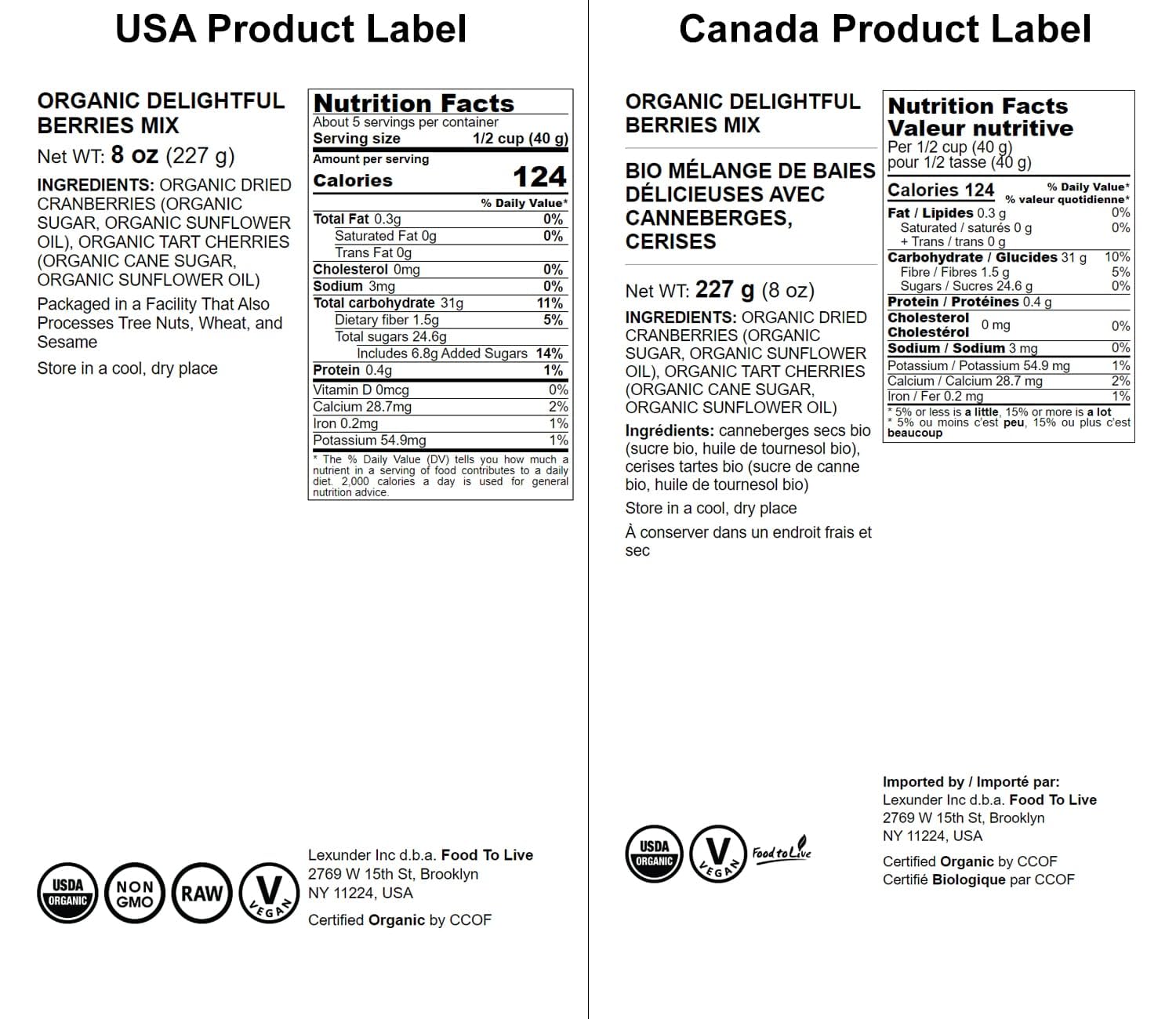 Q: Can I use Organic Delightful Berries Mix in baking or cooking?A: Absolutely! The dried cherries and cranberries in the mix can be added to baked goods like muffins or cookies, or used as a topping for salads, yogurt, and oatmeal.