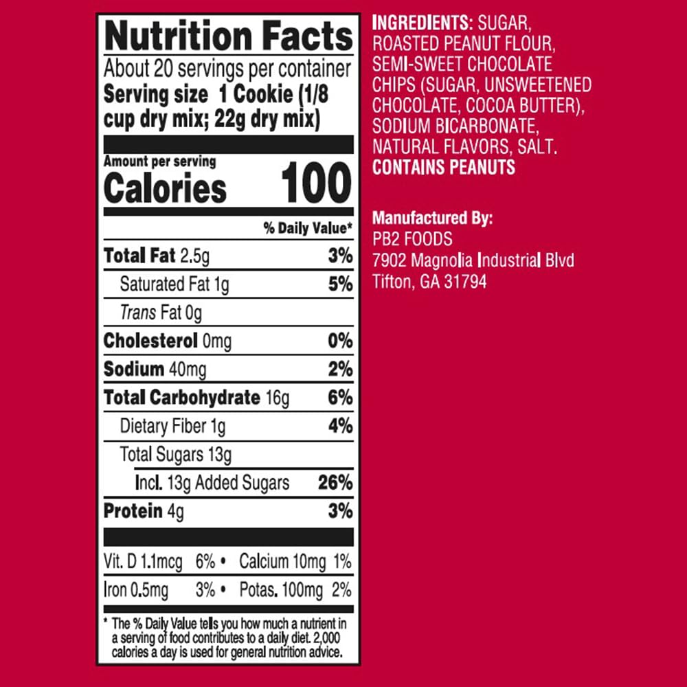 Q: What ingredients are in PB2 Pantry Chocolate Chip Cookie Mix?A: PB2 Pantry Chocolate Chip Cookie Mix is made with 6 simple and recognizable ingredients: Peanuts, sugar, chocolate chips, sodium bicarbonate, natural flavors, and salt. This ensures a healthier treat without artificial ingredients.