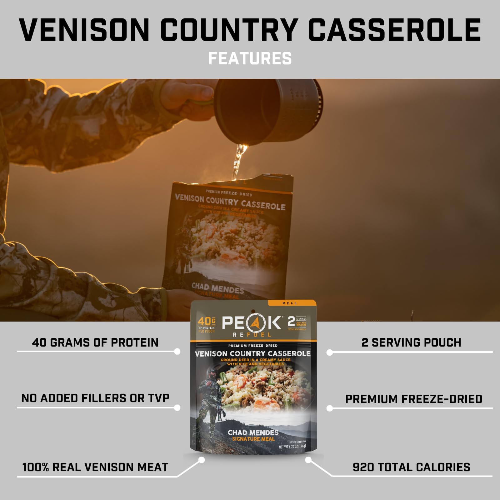 Peak Refuel Venison Country Casserole | Chad Mendes Signature Meal | Premium Freeze-Dried Variety Meals | Hunting, Survival, Cam