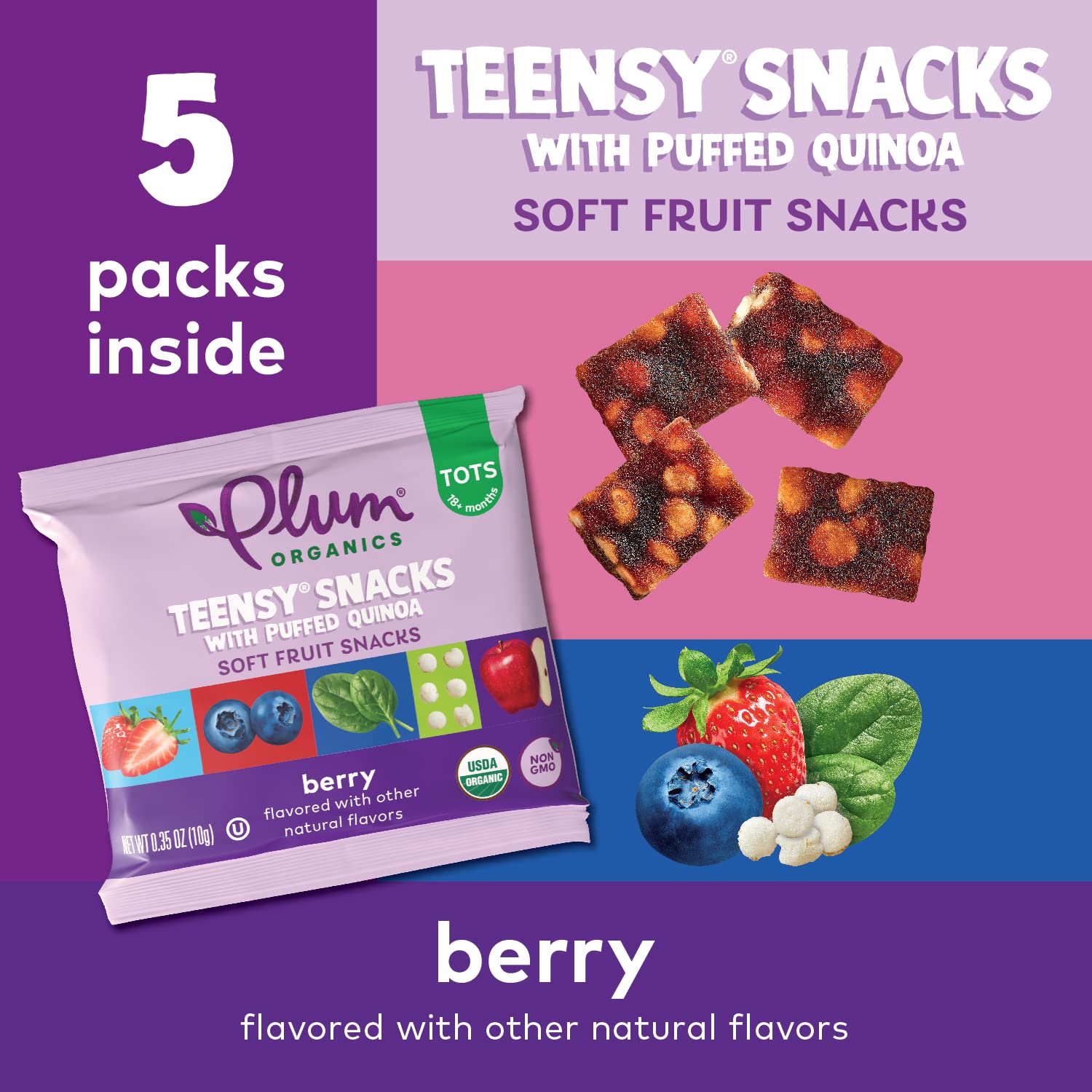 Q: What ingredients are used in Plum Organics Teensy Snacks?A: Plum Organics Teensy Snacks are made with organic apple puree, organic puffed quinoa, organic spinach puree, organic blueberry puree, and organic strawberry puree. All ingredients are USDA Organic Certified and Non-GMO.