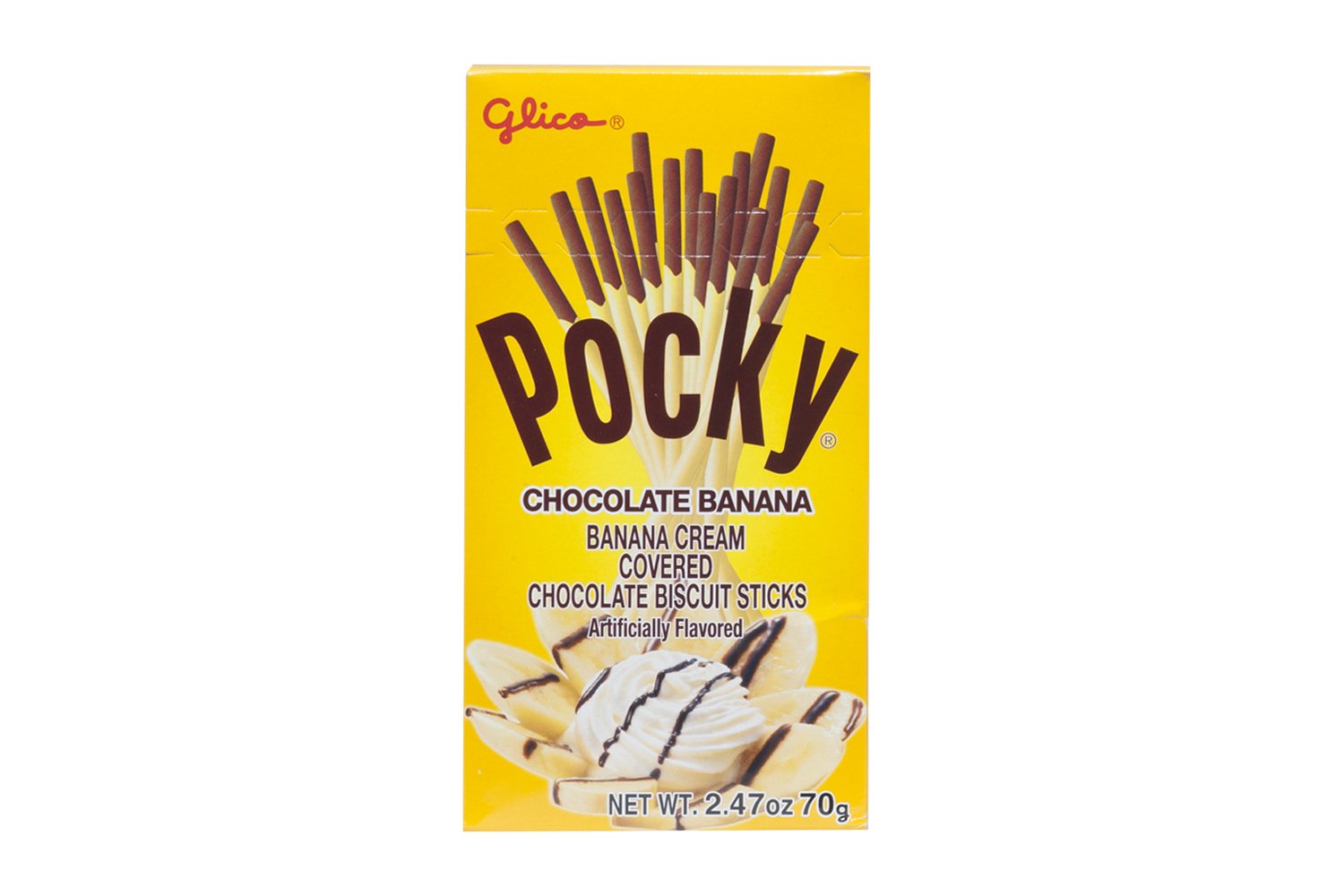 Did you know that Pocky is the most popular chocolate covered biscuit in Japan? Two delicious flavors combine into one sweet snack. Pairing the light crunch of a chocolate cookie stick with a smooth banana-flavored cream. Combine that with an easy-to-handle stick that keeps the cream off of your hands, and you've got the ultimate in snacking heaven. With plenty of sticks in each box, Pocky is about sharing happiness with friends, family, co-workers-anyone, anytime, anywhere. Just open a box, pass it around, and watch the smiles and happiness spread. 1box /70gram, 2.47 ounce. 10 boxes/tray.