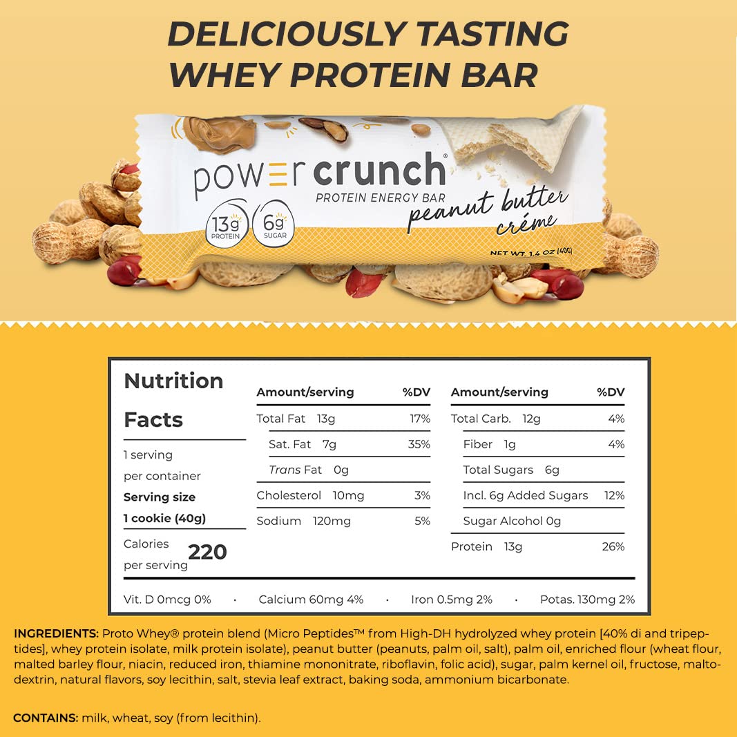 Power Crunch Protein Energy Bar Original Peanut Butter Crme. 13 grams protein. 05 grams sugar.