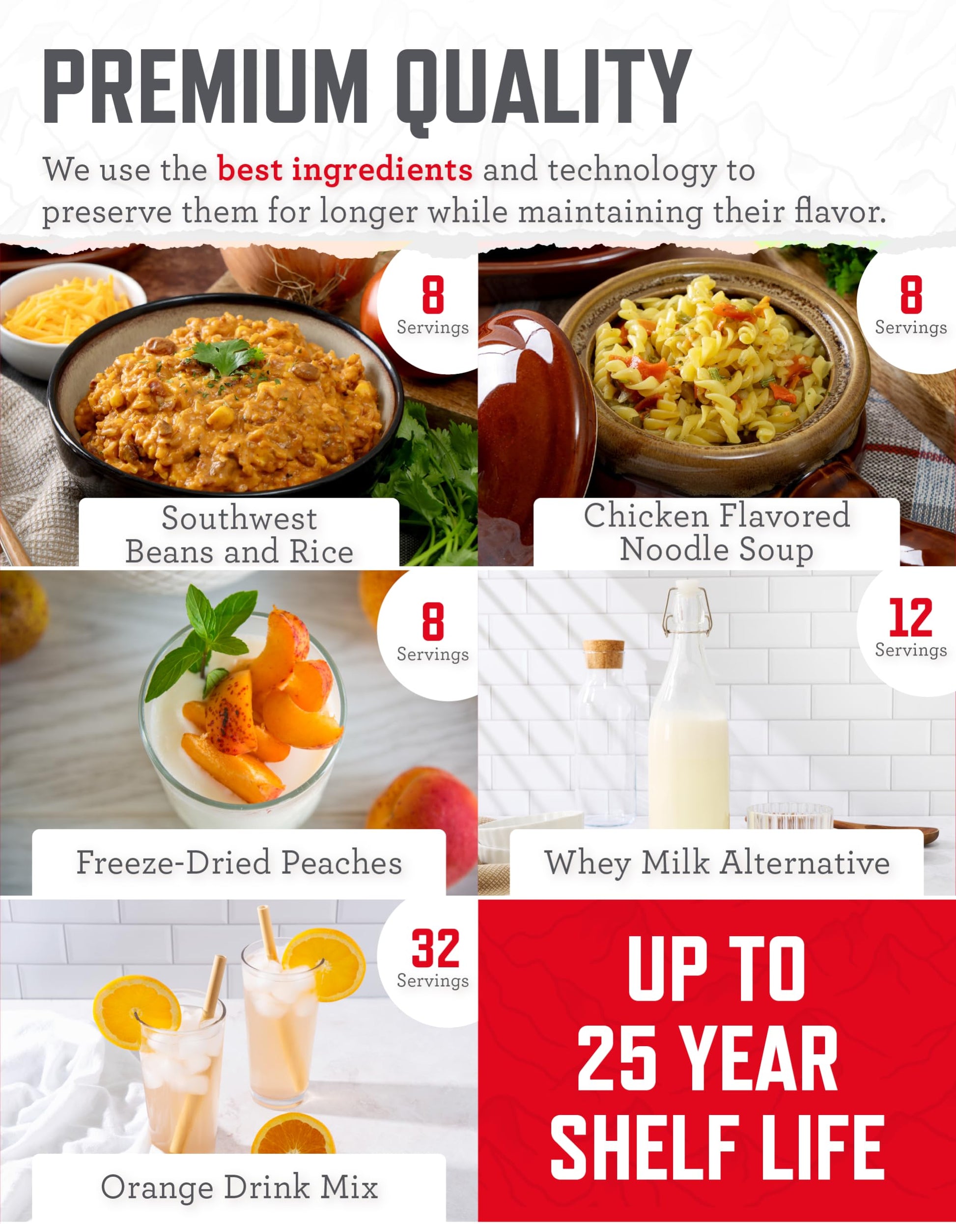 Q: How long does the ReadyWise food supply last?A: The ReadyWise Emergency Food Supply is designed to last up to 25 years when stored properly, ensuring you have access to nutritious meals during emergencies.