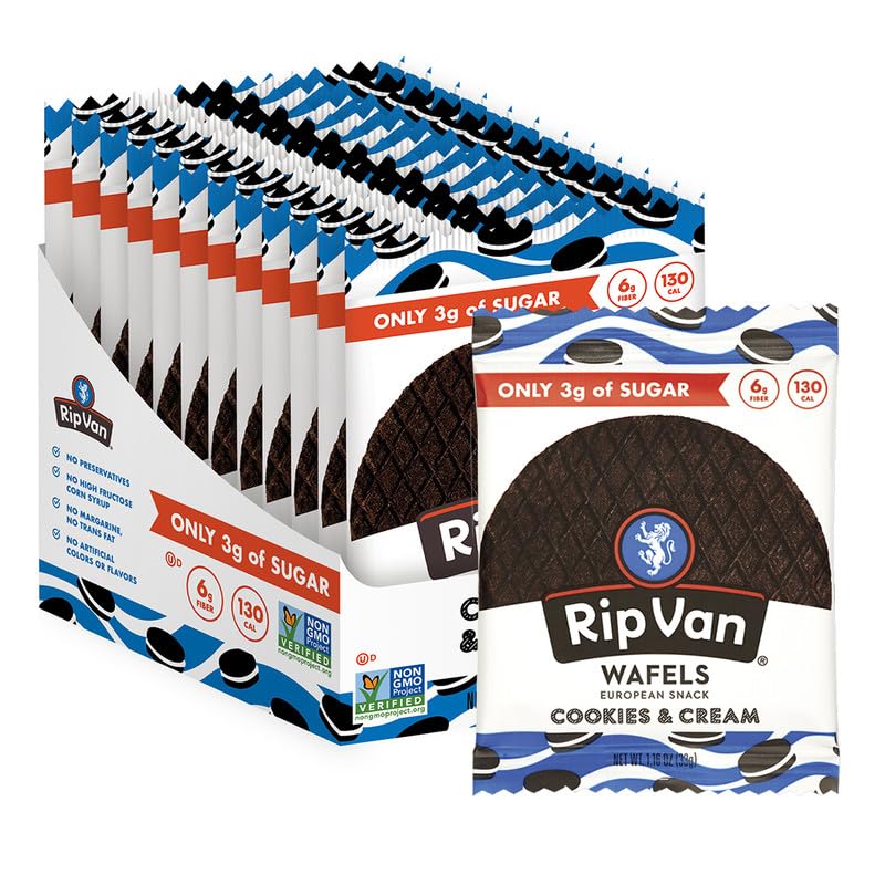 Q: What are the nutritional benefits of Rip Van Wafels Cookies & Cream Stroopwafels?A: Rip Van Wafels Cookies & Cream Stroopwafels offer a healthy snack option with only 3g of sugar, 120 calories, and 6g of fiber per 33g serving. They are also low in trans fats, making them a nutritious choice for those looking for healthier snacks.