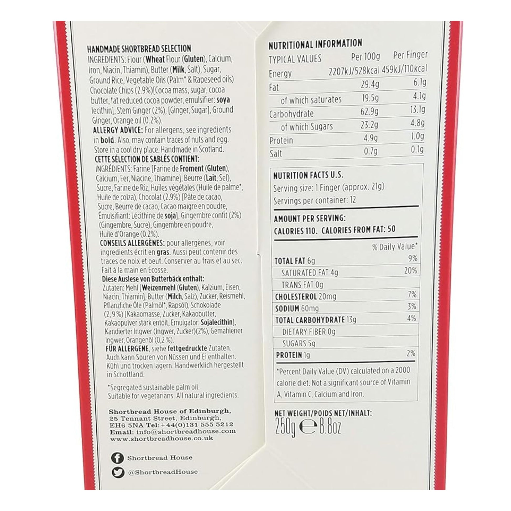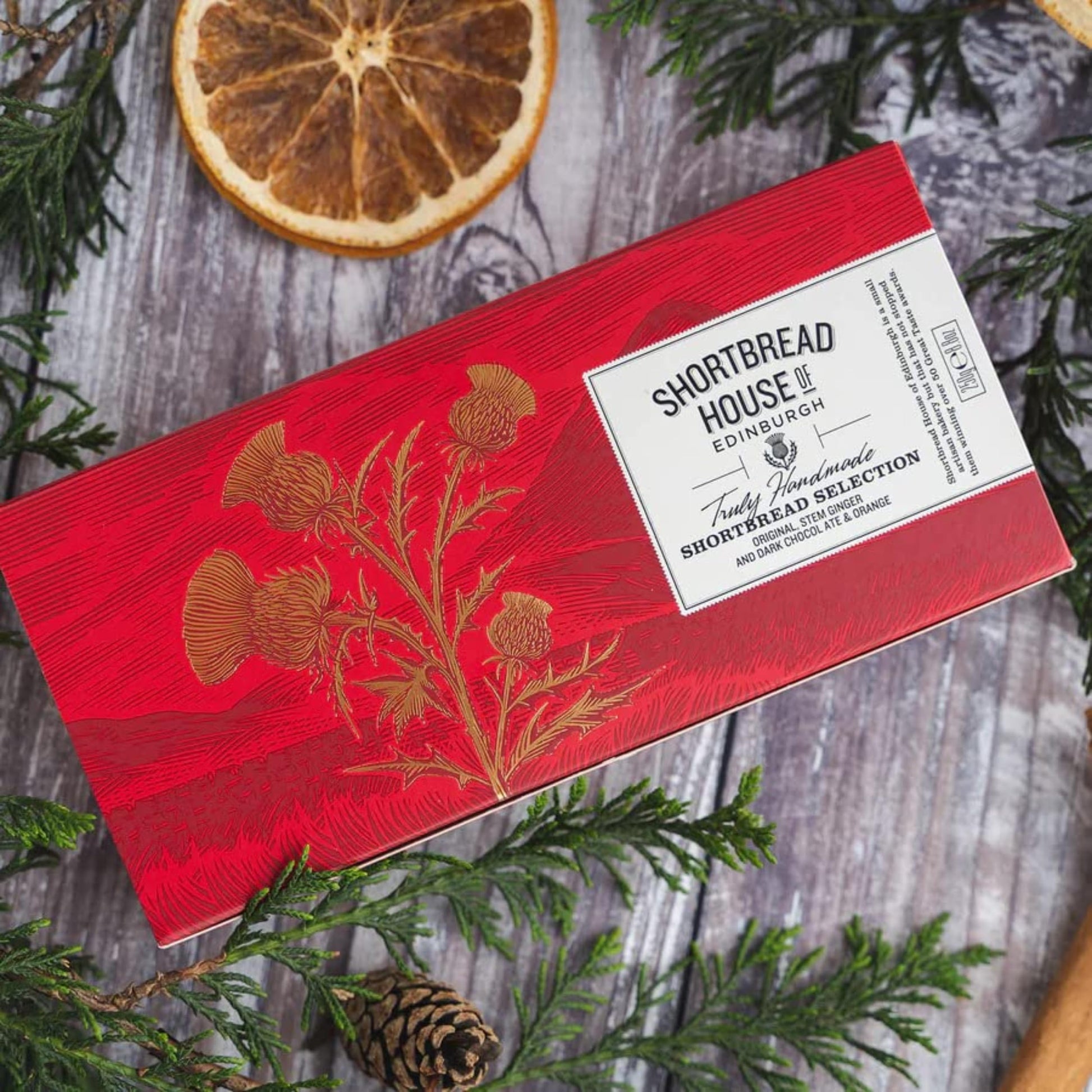 Q: What flavors are included in the Shortbread House of Edinburgh selection box?A: The selection box contains three popular flavors of shortbread: Original, Stem Ginger, and Chocolate & Orange.
