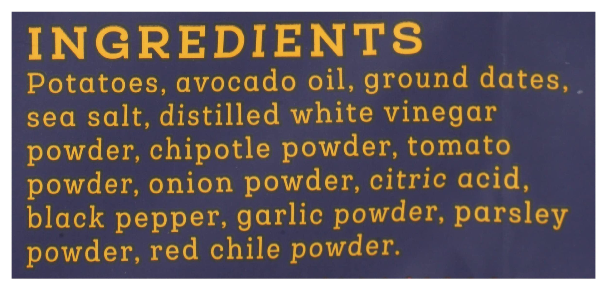 Q: What are the ingredients in Siete Kettle Cooked Chipotle BBQ Potato Chips?A: Siete Kettle Cooked Chipotle BBQ Potato Chips are made from quality potatoes, seasonings, and spices, specifically designed to deliver a smoky chipotle BBQ flavor. For a full list of ingredients, please check the packaging.