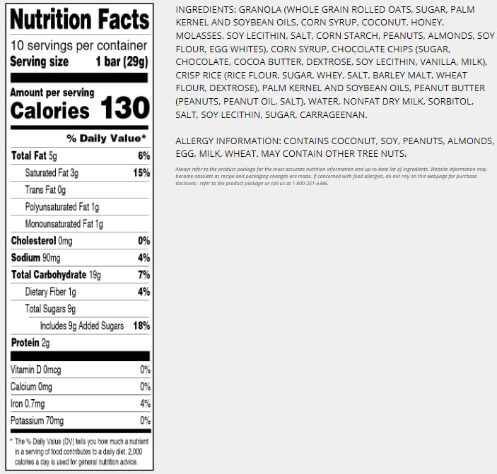 Q: What ingredients are in Sunbelt Bakery Peanut Butter Chocolate Chip Chewy Granola Bars?A: Sunbelt Bakery Peanut Butter Chocolate Chip Chewy Granola Bars feature a blend of smooth peanut butter, mini chocolate chips, and granola, making them a delicious and wholesome snack option.