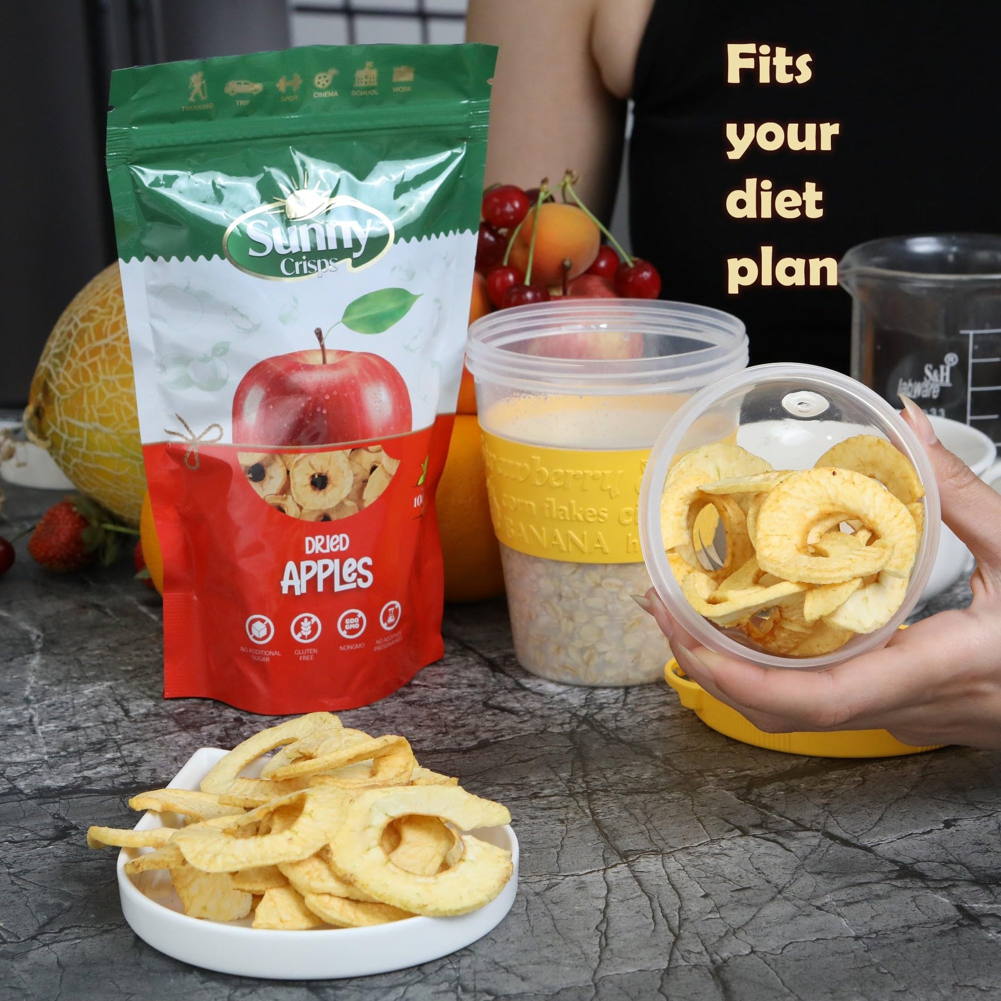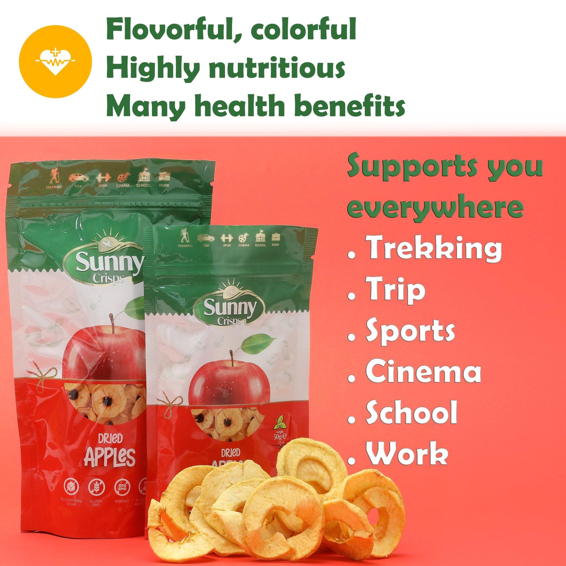 - Q: What are the health benefits of SUNNY CRISPS Dried Apples? A: SUNNY CRISPS Dried Apples are a nutritious snack option, packed with fiber and essential vitamins. They are gluten-free and contain no added sugar, making them a guilt-free treat that supports healthy digestion and can contribute to a balanced diet.