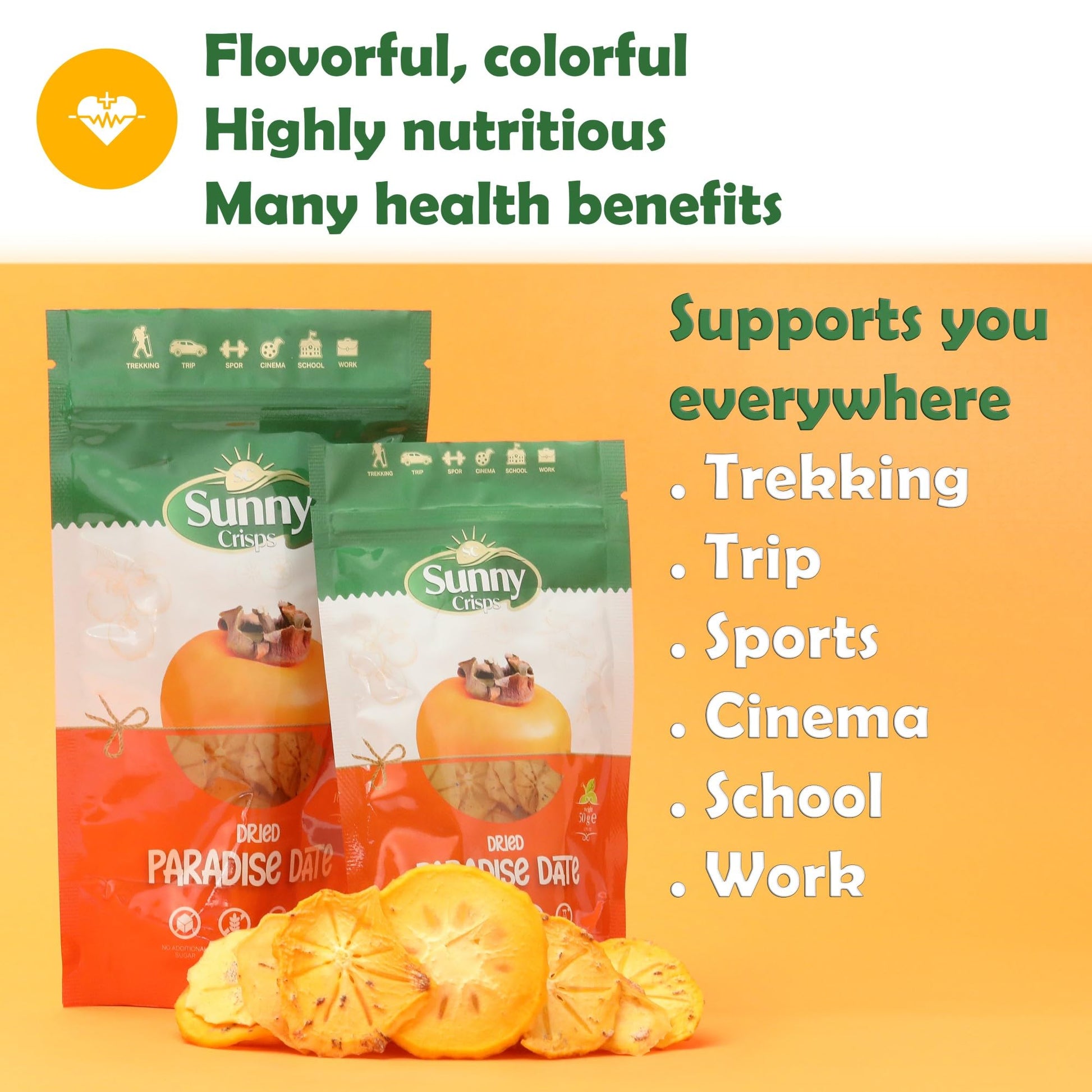 Q: What makes SC Sunny Crisps dried persimmons different from other dried fruits?A: SC Sunny Crisps dried persimmons are made from high-quality Turkish Trabzon persimmons, with no sugar added and free from sulfur. Their natural sweetness and chewy texture set them apart as a healthy, guilt-free snack.