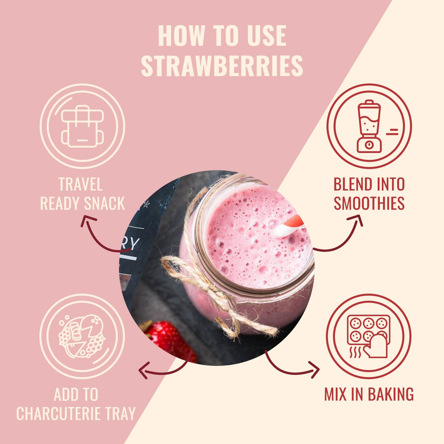 Q: What are some creative ways to use dried strawberries in meals?A: You can enjoy Sunny Fruit Dried Strawberries in various ways, such as adding them to smoothies, mixing with granola or yogurt, including in cheese platters, or simply snacking straight from the bag.