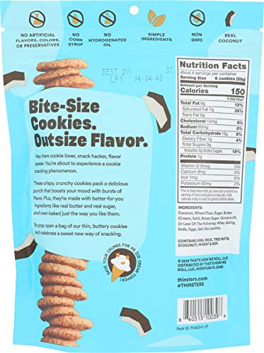 Q: What ingredients are used in Thinsters Cookies?A: Thinsters Cookies are made with simple, better-for-you ingredients including real butter, real sugar, and real coconut. They contain no corn syrup, no hydrogenated oils, and no artificial flavors or colors.